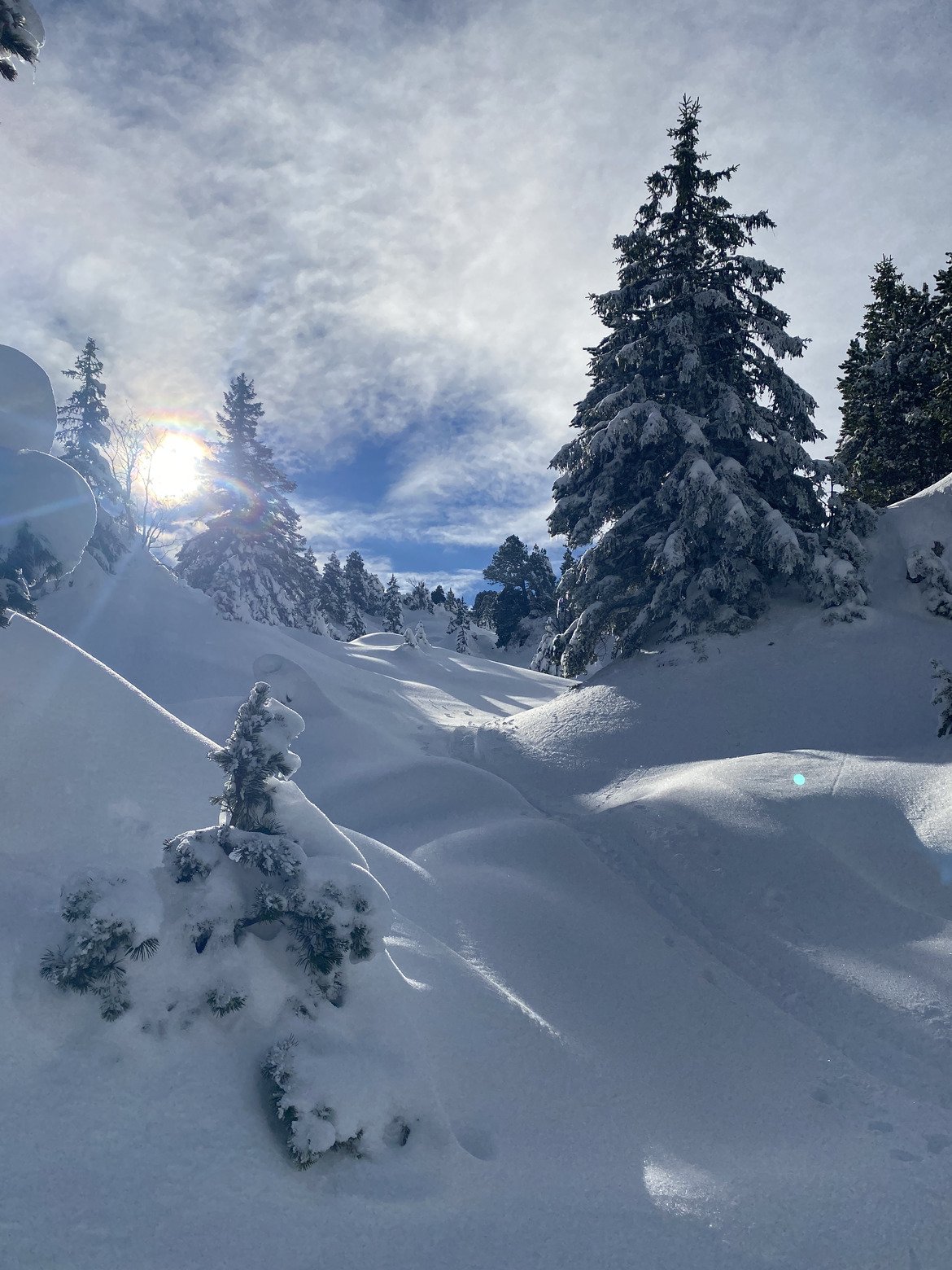 La première descente depuis la Croix de l'Aulp du Seuil jusqu'au fond du Vallon met déjà la banane, poudre scintillante et légère. Le seul inconvenient c'est que c'est trop court.