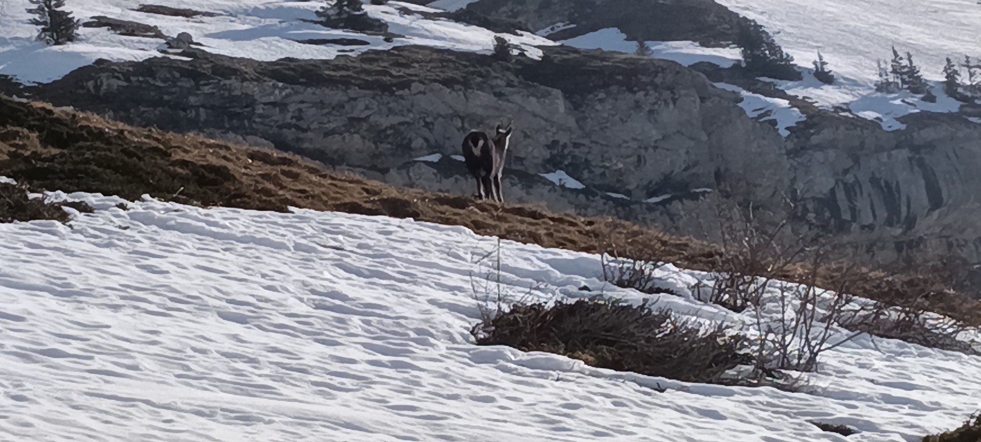 La montée de la prairie se passe sans encombres, il n'y a qu'à suivre la trace, efficace sans être trop raide. Vers le sommet de celle-ci, on aperçoit une harde de chamois venus brouter un peu d'herbe sur une zone dégarnie.
