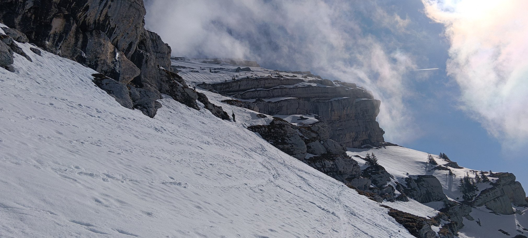 On met les crampons avant d'attaquer la montée du Pas de l'Oeille. Ça passe plutôt bien - globalement la trace est faite - mais il y a tout de même certaines sections un poil plus tendues, où la neige est encore bien dure, sans être gelée pour autant. Je ne regrette pas d'avoir pris le piolet, c'est plus rassurant. Arrivés au sommet vers 11h40, avec toujours pas mal de vent qui a tendance à retarder le décaillage, on se dit qu'on a intérêt à se faire une petite descente sur le plateau sommital, afin de redescendre dans le bon timing.