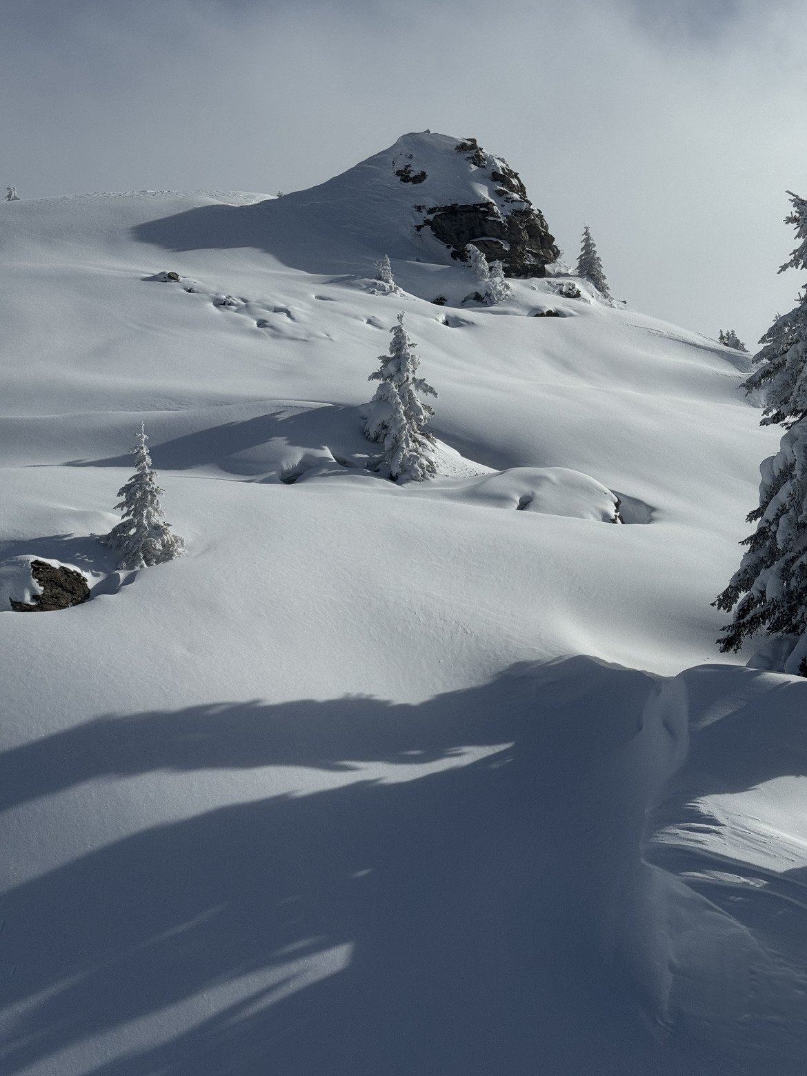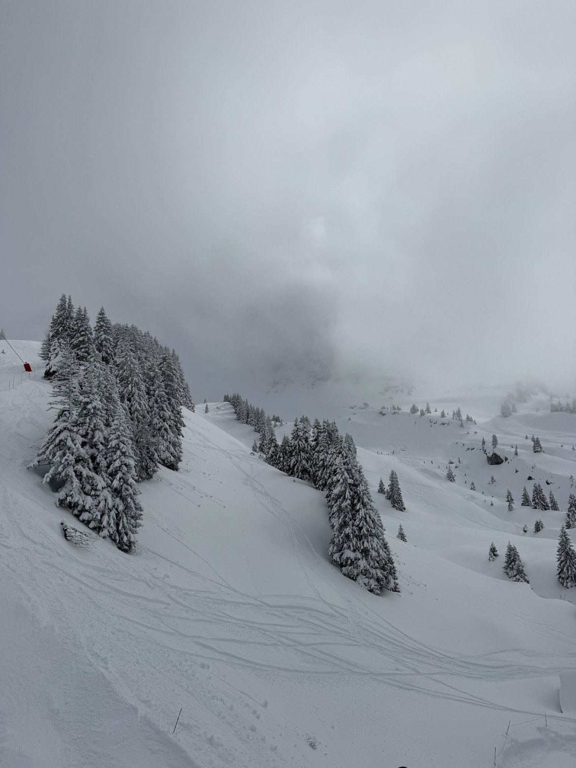 La neige est fraîche mais hyper lourde, elle a pris en humidité c’est dingue, rien à voir avec hier.