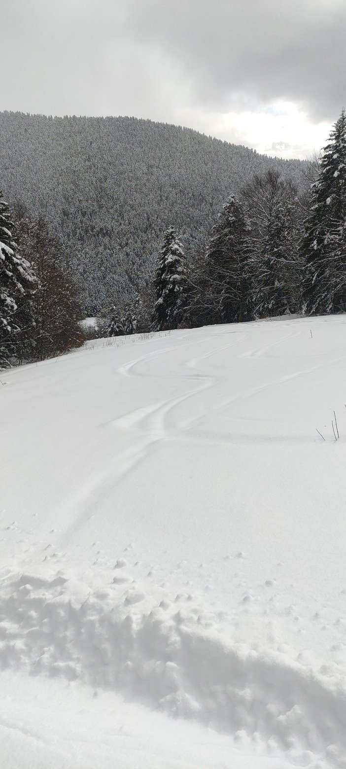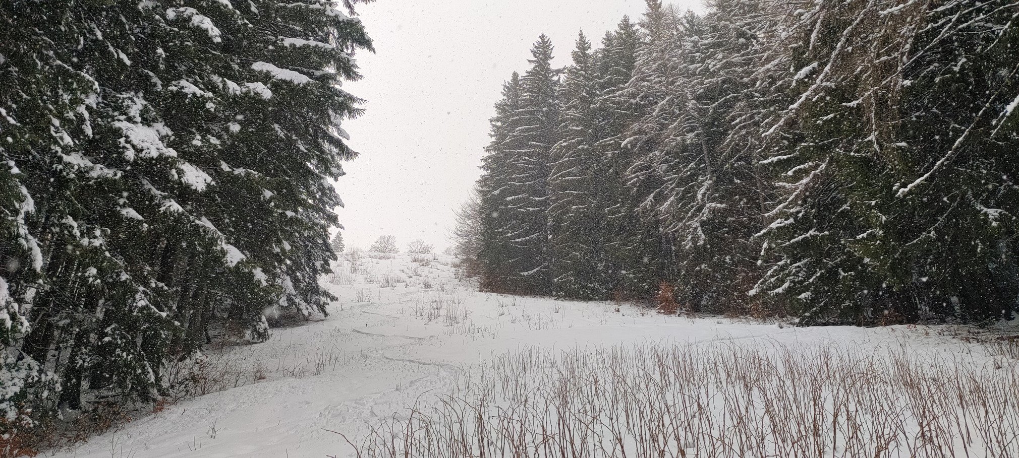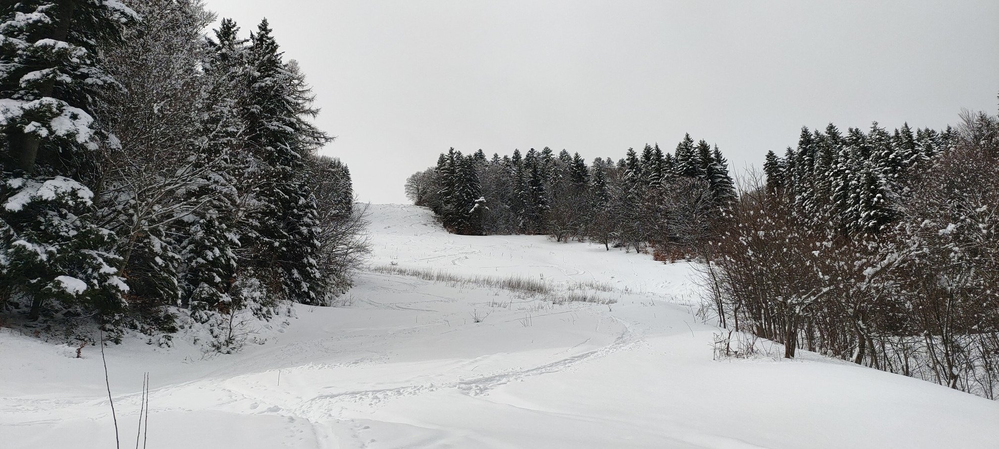 Est-ce- que les variations de température ont pu jouer (le soleil avait un peu percé à cet endroit pendant la montée, ça chauffait un peu, même si ça n'a rien à voir avec le printemps) ? Et/ou la nature bien herbeuse de cette pente ? Je suis bien incapable de le dire. Je poursuis la descente sur l'ancienne piste rouge, dans des pentes encore plus faibles. Ici, on ne ressent plus cette superposition de couches de neige que j'évoquais un peu plus tôt. Mais la poudre est franchement lourdingue et finit même par coller sur le bas. Ça se skie sans soucis car les quelques traces qu'il y avait ont été recouverte par la petite chute des dernières heures... mais ce n'est franchement pas ouf.