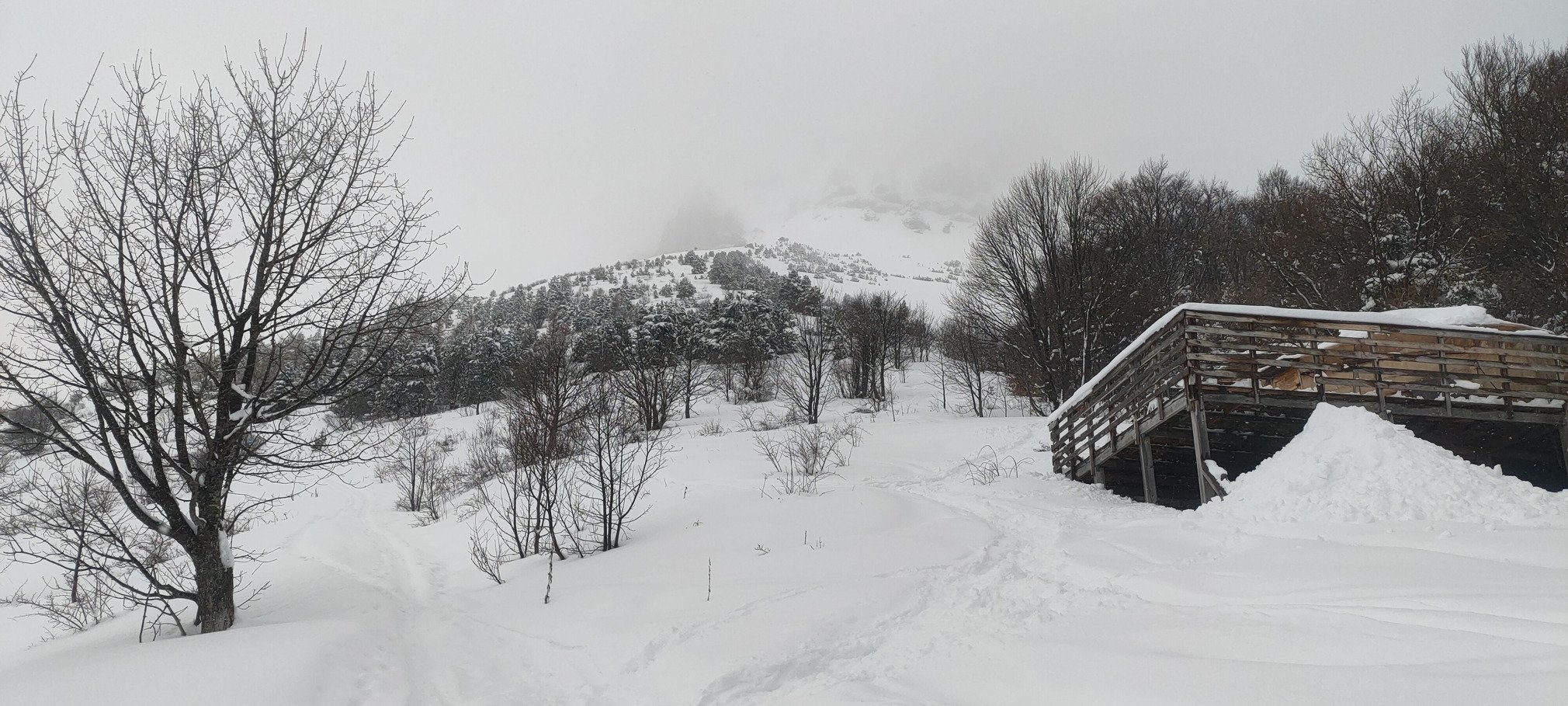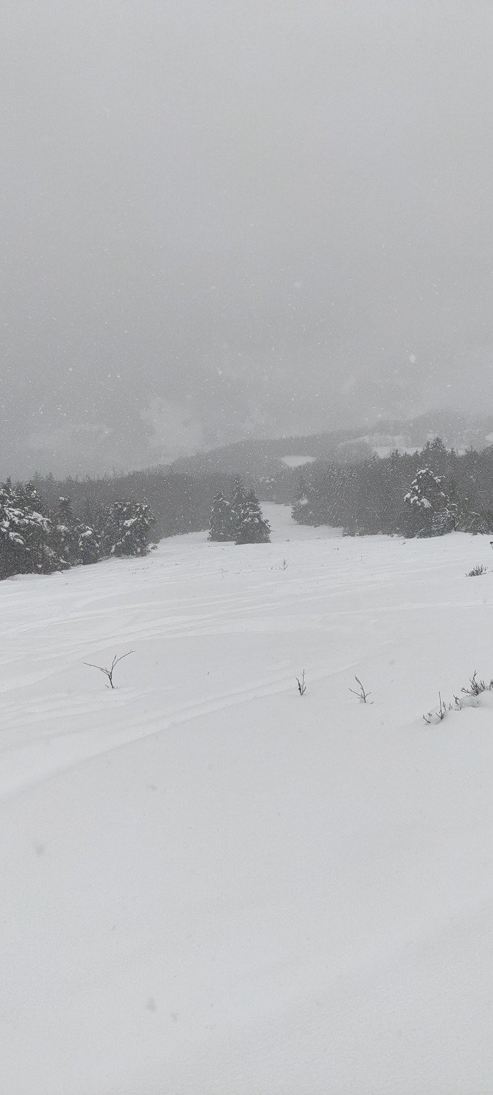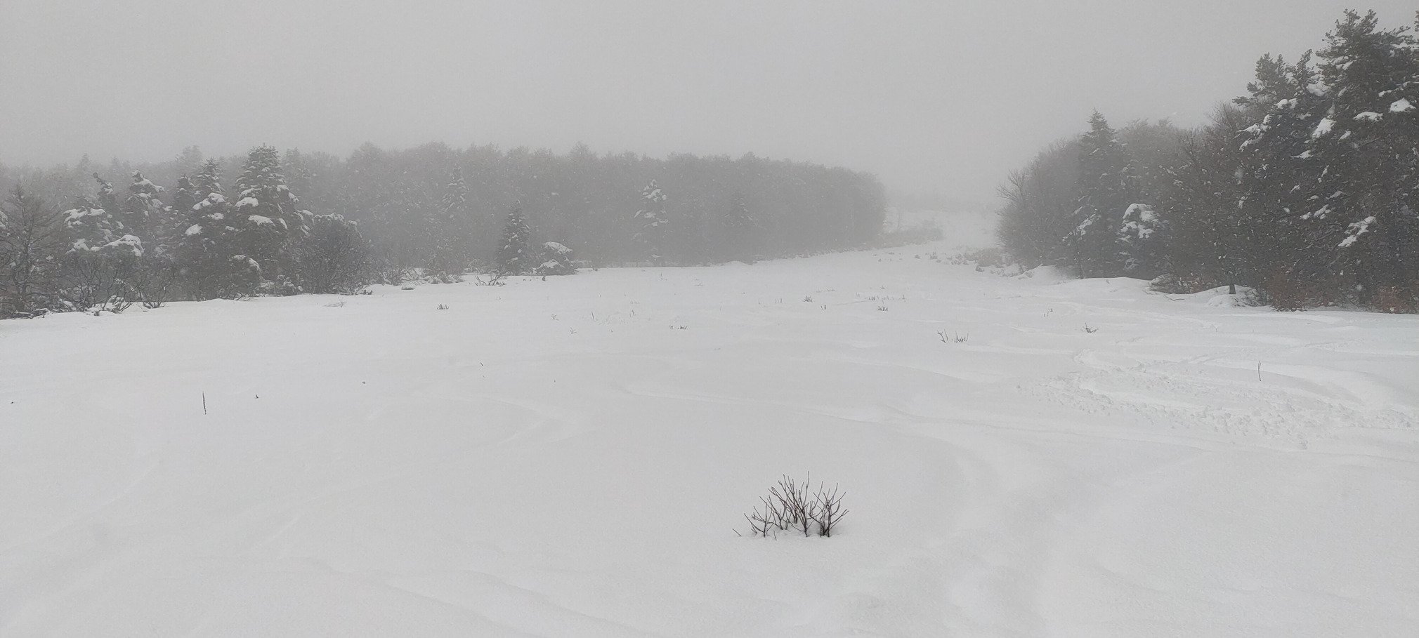Est-ce- que les variations de température ont pu jouer (le soleil avait un peu percé à cet endroit pendant la montée, ça chauffait un peu, même si ça n'a rien à voir avec le printemps) ? Et/ou la nature bien herbeuse de cette pente ? Je suis bien incapable de le dire. Je poursuis la descente sur l'ancienne piste rouge, dans des pentes encore plus faibles. Ici, on ne ressent plus cette superposition de couches de neige que j'évoquais un peu plus tôt. Mais la poudre est franchement lourdingue et finit même par coller sur le bas. Ça se skie sans soucis car les quelques traces qu'il y avait ont été recouverte par la petite chute des dernières heures... mais ce n'est franchement pas ouf.