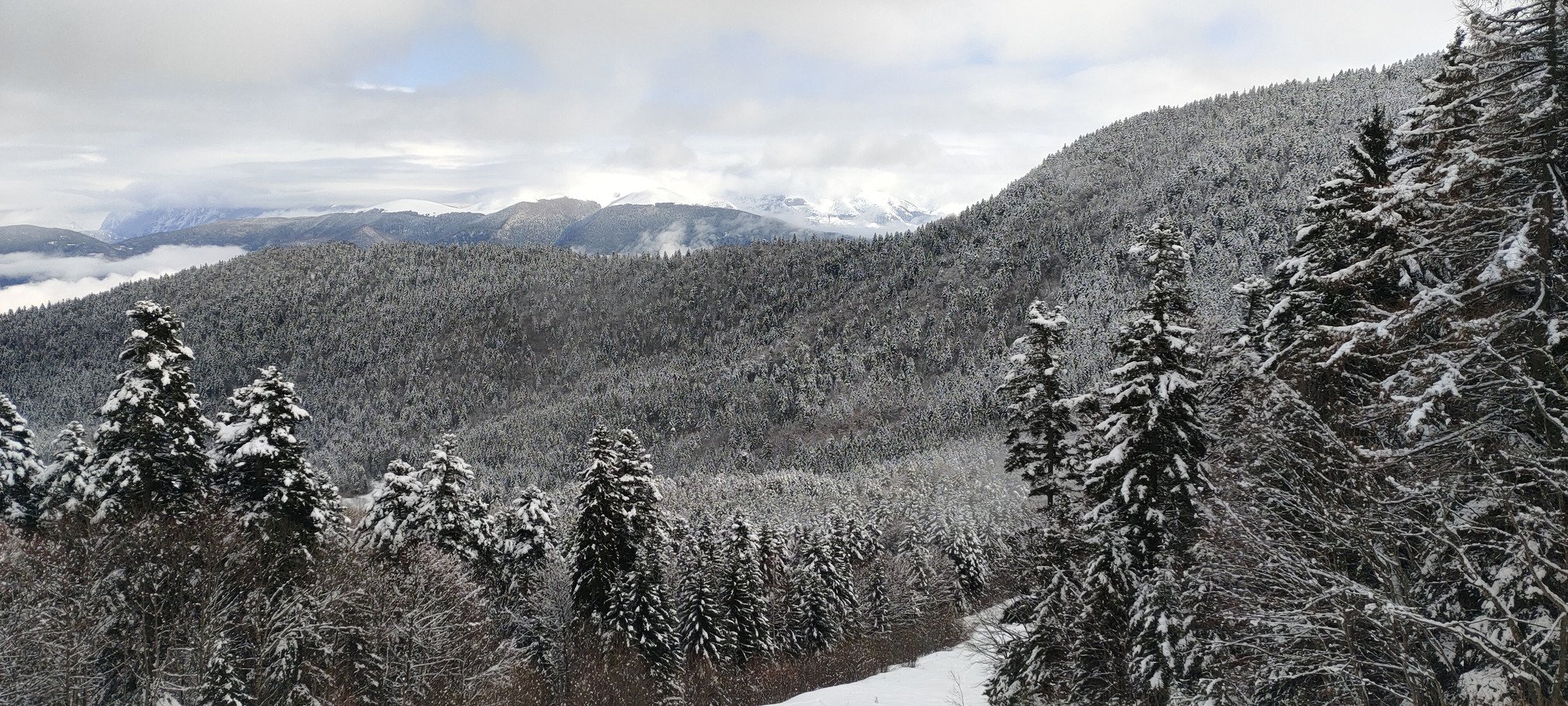 Arrivé là haut vers 12h30, il fait autour de O degré. L'ambiance est un peu humide, avec la neige qui commence un peu à tomber des arbres. Je comprends vite que la poudreuse sera plus lourde qu'hier à Chamrousse. Normal, on est plus bas en altitude (le col est à 1154 m, et je suis monté à environ 1800 m au plus haut). Cela dit, ça ne botte pas, c'est déjà ça.