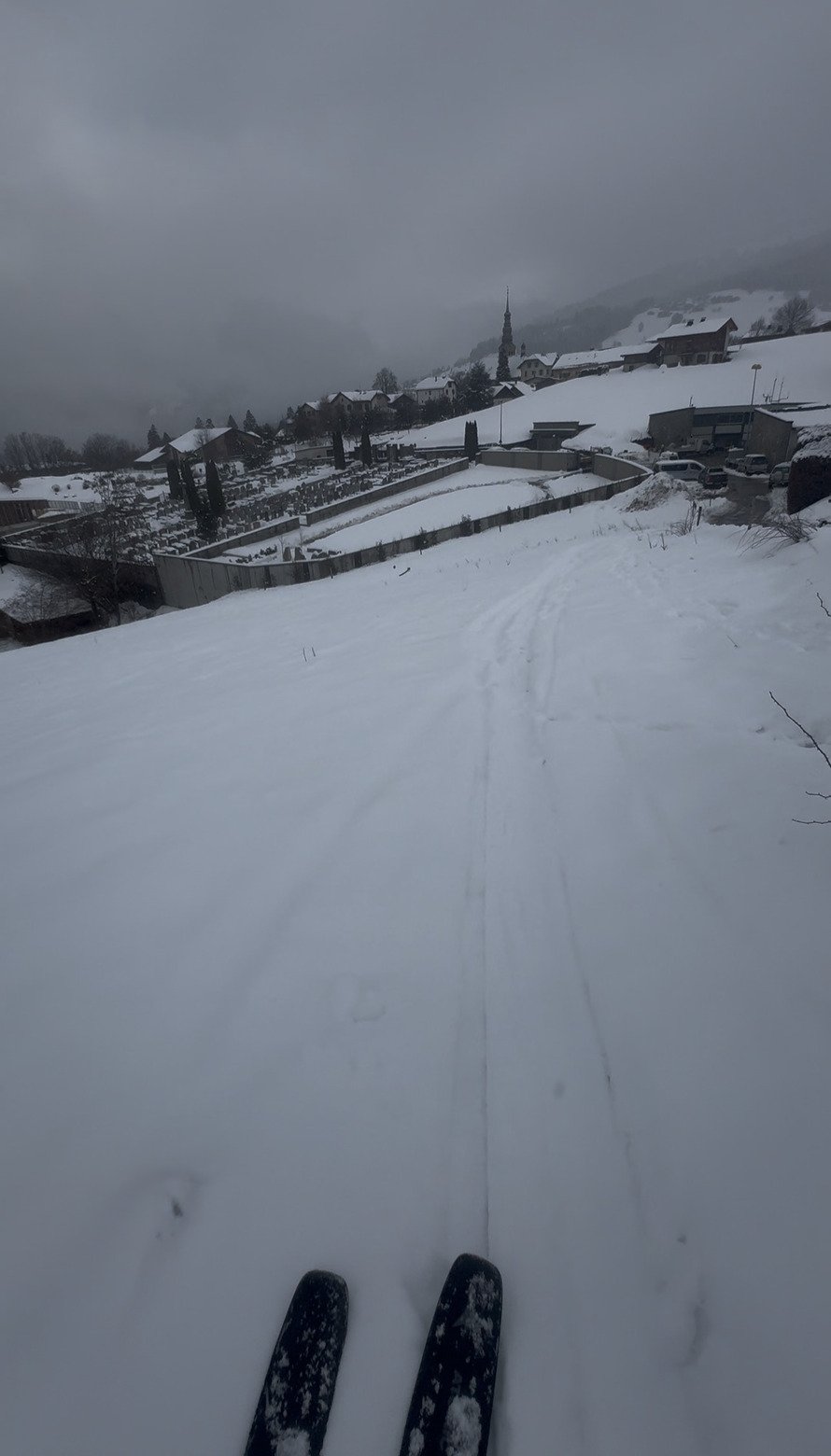 Descente à ski jusqu’au cimetière, avec quelques passage de routes et chemins bien trop déneiger à mon goût 🤣