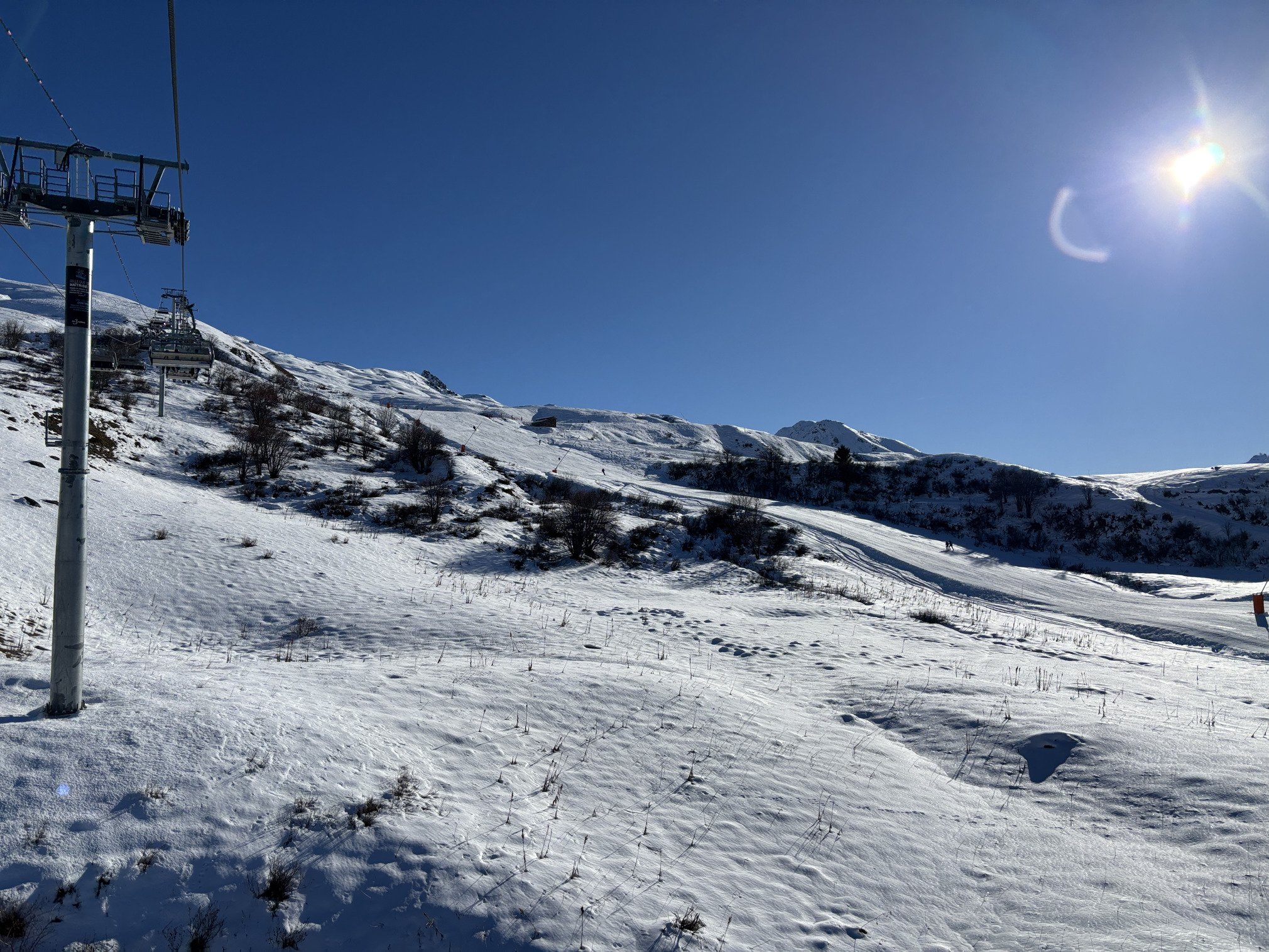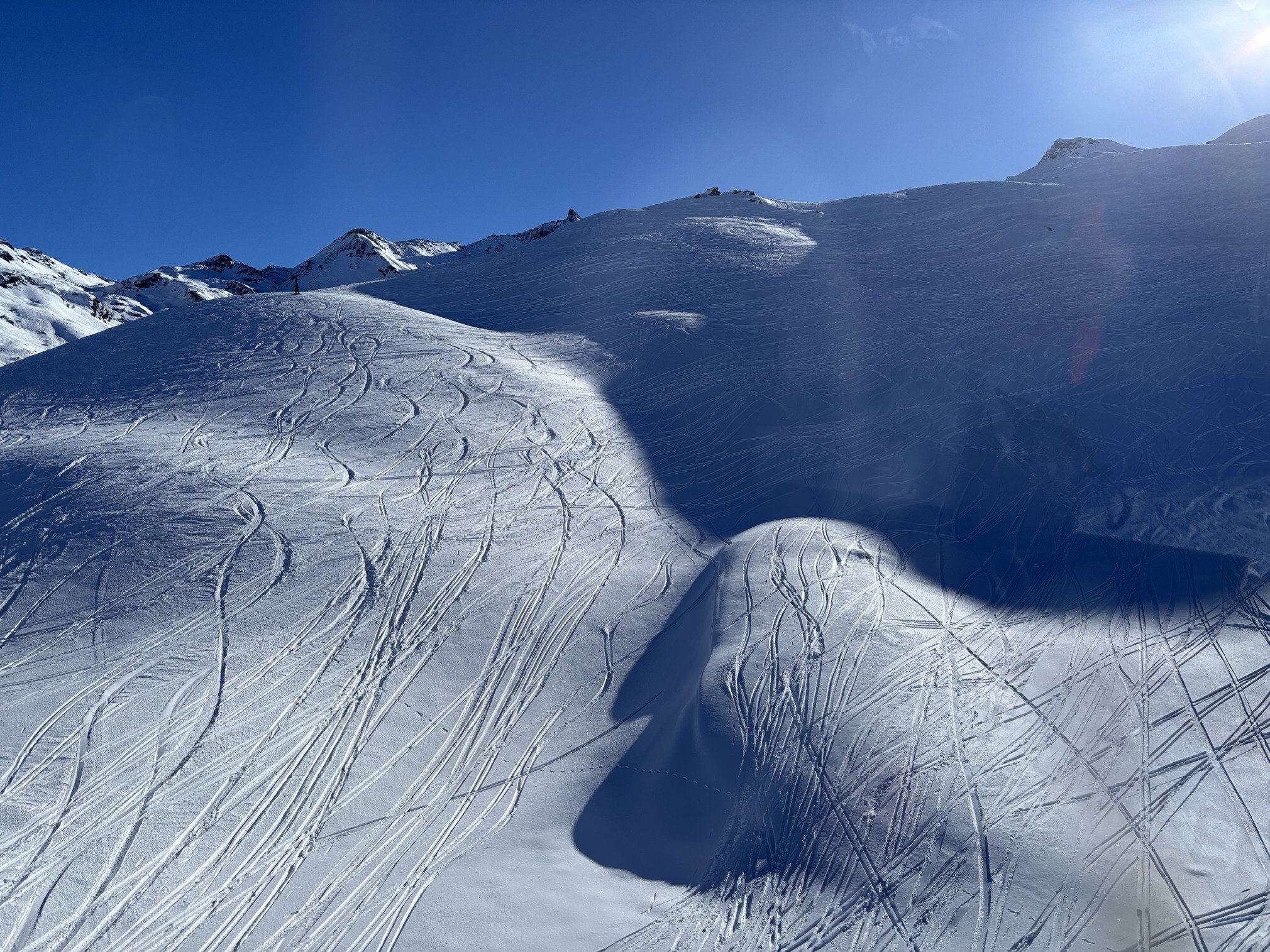 Peu de moments grandioses aujourd’hui sur Courchevel, des gratons dans la Saulire, du carrelage indigne et dangereux aux Praz et à La Tania, bien mais sans plus à Chanrossa où on peut encore trouver de la poudre si on ne tient pas à ses lattes, restent bien les Pyramides pour sauver le truc mais on attend au tire-cul vu qu’un des deux est alternativement arrêté pour cause de peu de monde…