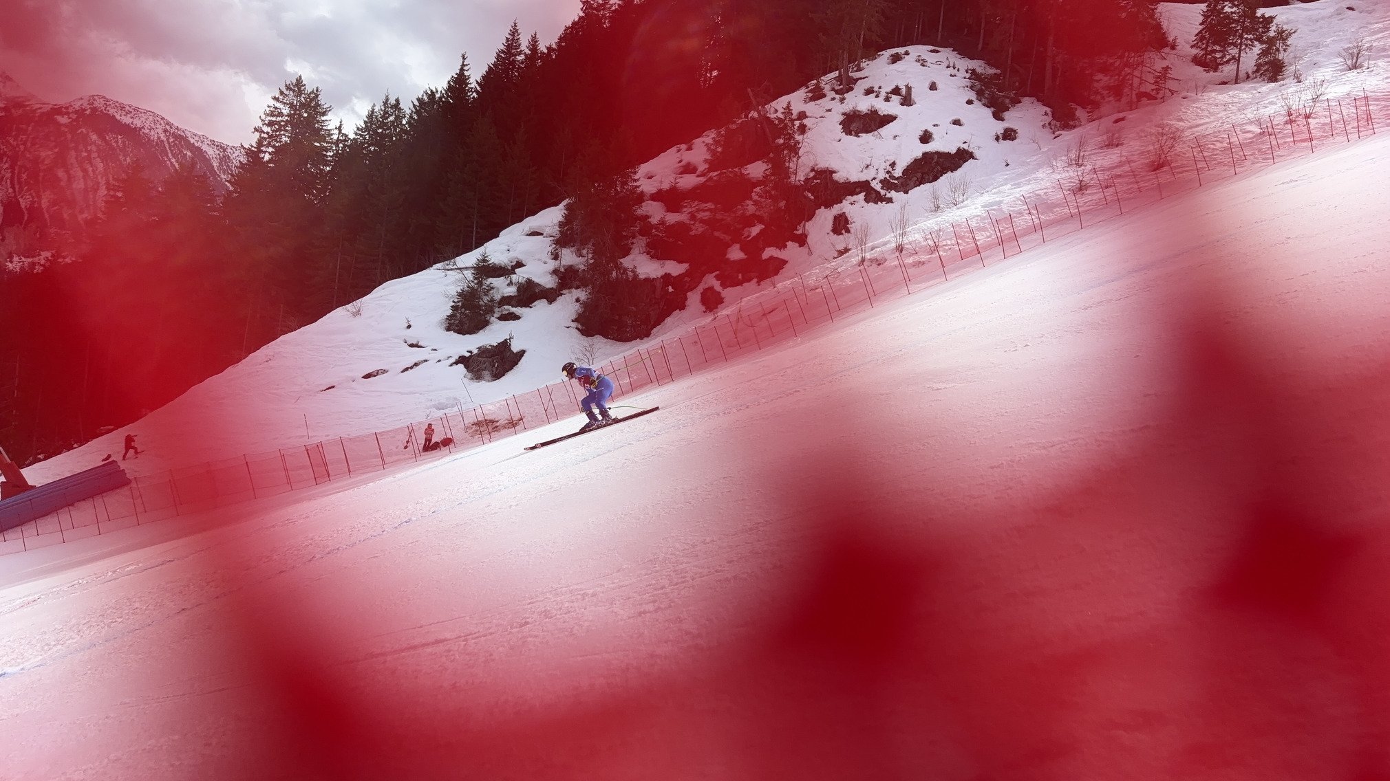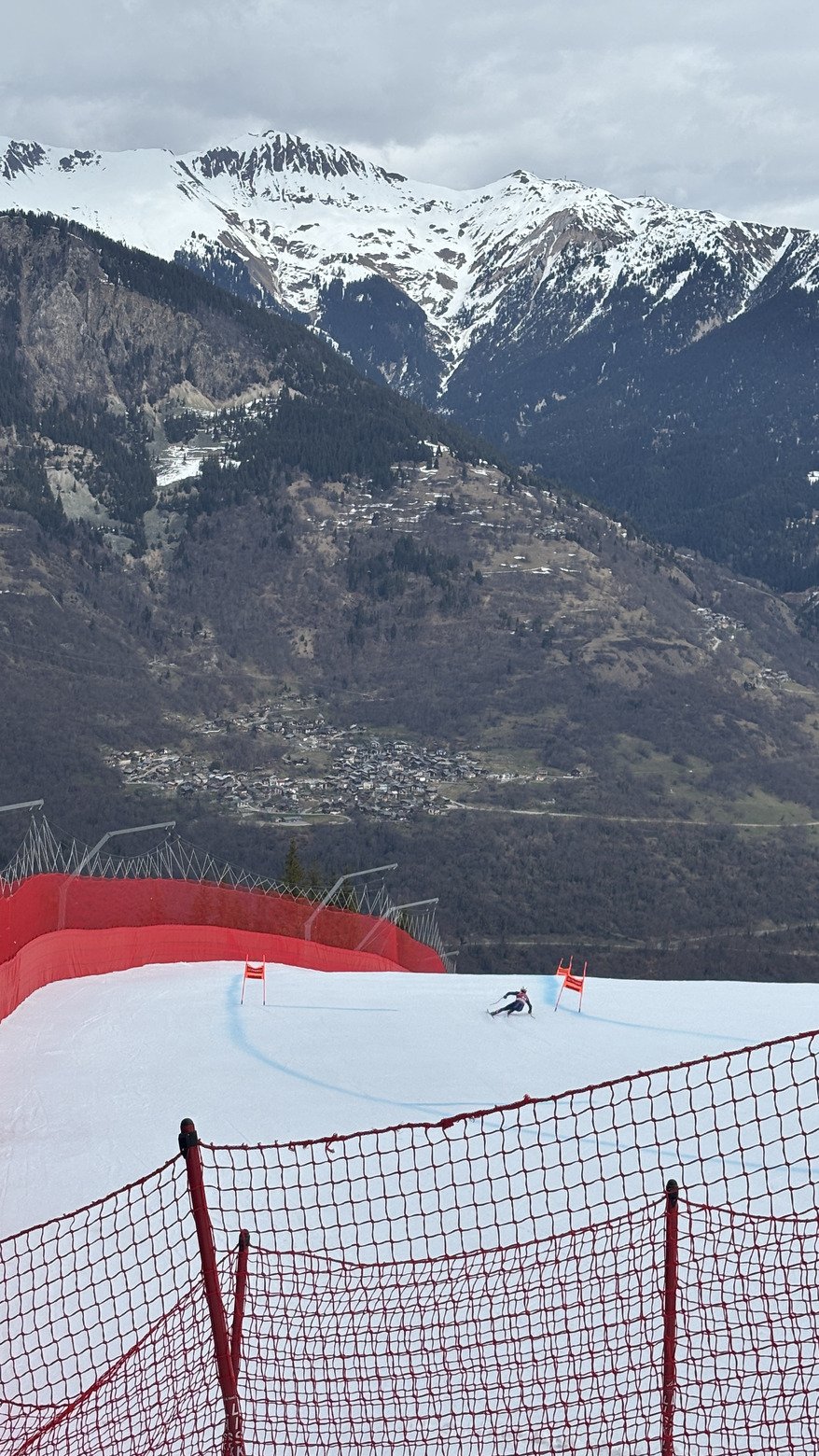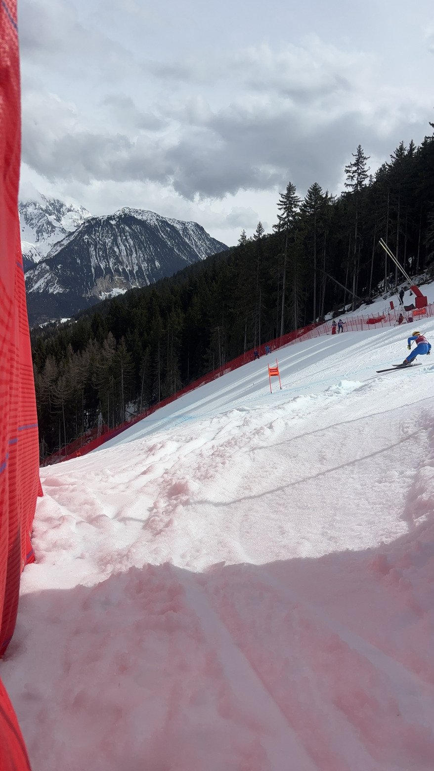 Montée un peu hasardeuse pour aller voir les entraînements de la descente sur l’éclipse. J’ai pris à travers la forêt pour être le plus proche de la piste mais c’était pas une grande idée, obligé de poser les skis par manque de neige en sous bois. Je me débrouille tant bien que mal à rejoindre le bouc blanc.
