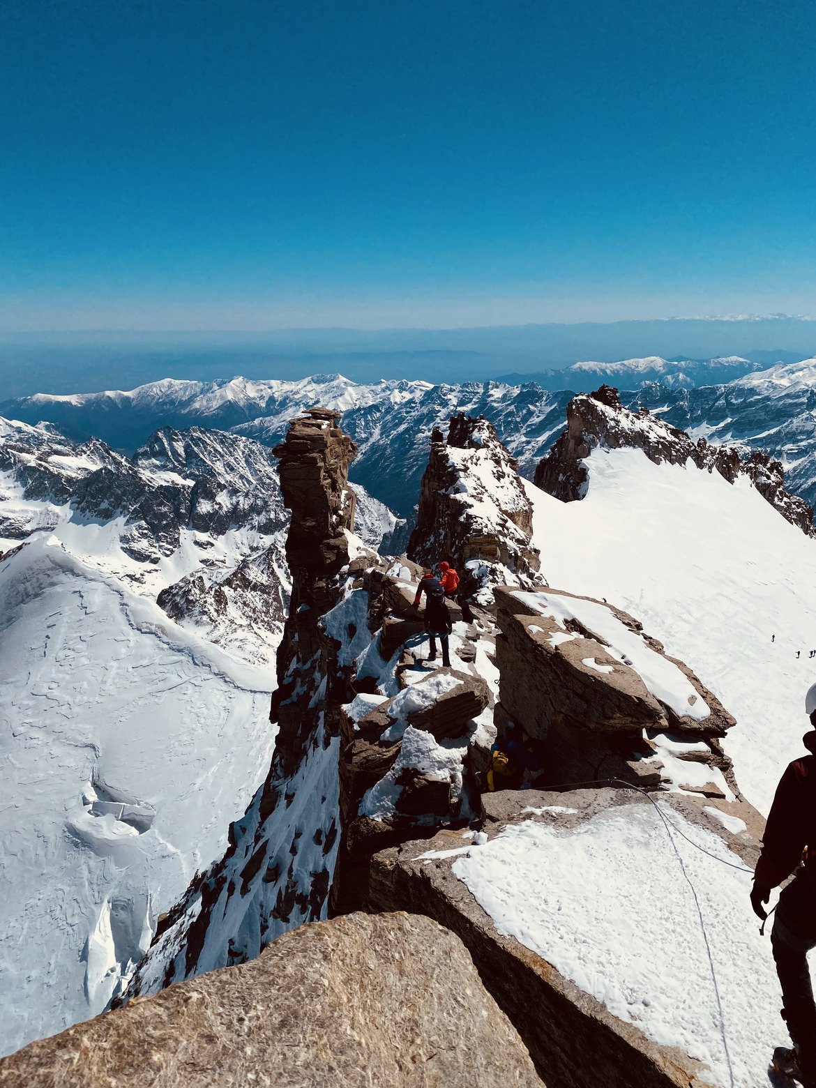 On a eu pas mal de vent au col juste avant d’arriver sur le glacier. Beaucoup de cordée on fait demi tour. On a préservé et on a bien fait. Passé ce couloir de vent venant NNW les conditions étaient excellentes. Une légère brise et un temps chaud pour 4000m. J’ai fini sans les gants. L’accès au sommet se fait désormais par un « sens imposé » grâce à une via ferrata. Ces travaux facilitent grandement la descente, on évite de se croiser sur la vire exposée.