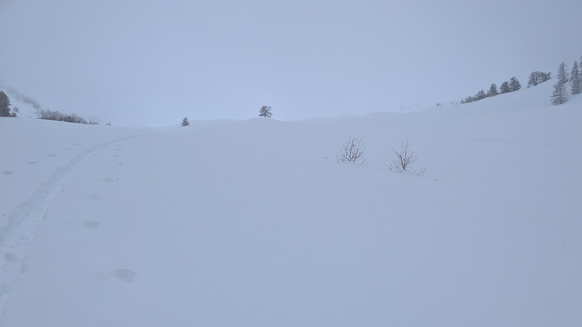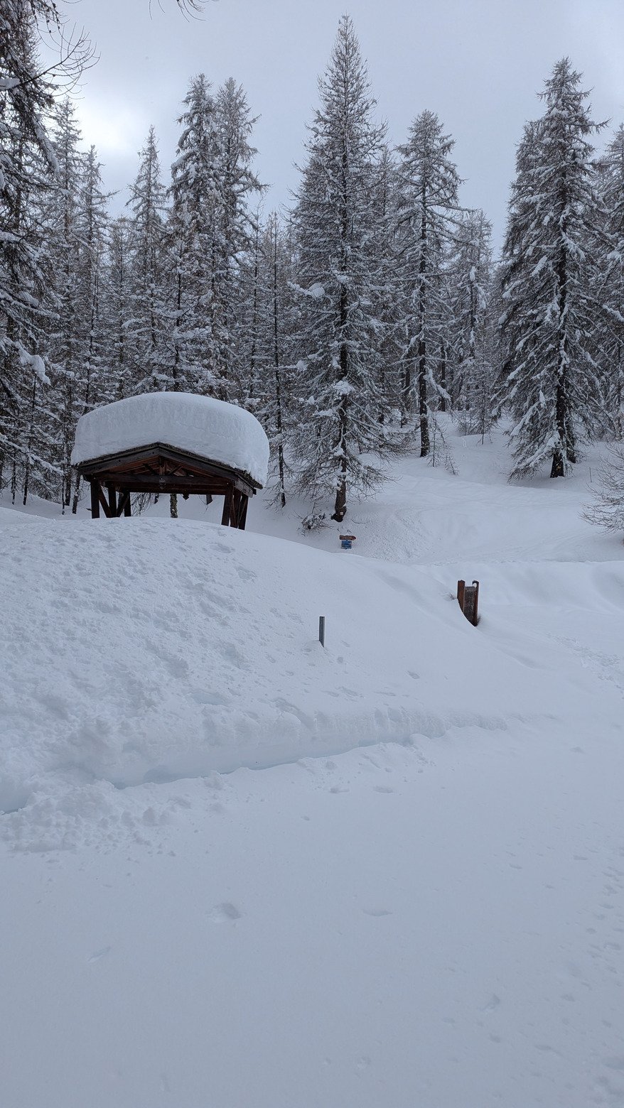Neige cette nuit et ce matin a Crevoux. Les enfants ne peuvent pas faire de cours de skating ce matin ce sera classique avec ballade sous la neige. Moi j'attends l'accalmie qui arrive en début d'aprem mais le réchauffement aussi. Au total environ 25 de fraîche a 1600 tombé sans vent. Par contre neige qui s'alourdit, purges dans les faces raides. Je monte jusqu'à la sortie de la forêt vers 2100. A 2000 mon bâton de 130 s'enfonce totalement. Descente pas mémorable, trop de neige et pas assez de pente sur le haut et neige trop humide en bas limite du skiable..... Dommage, pas sur que ce soit mieux en fin de semaine.
