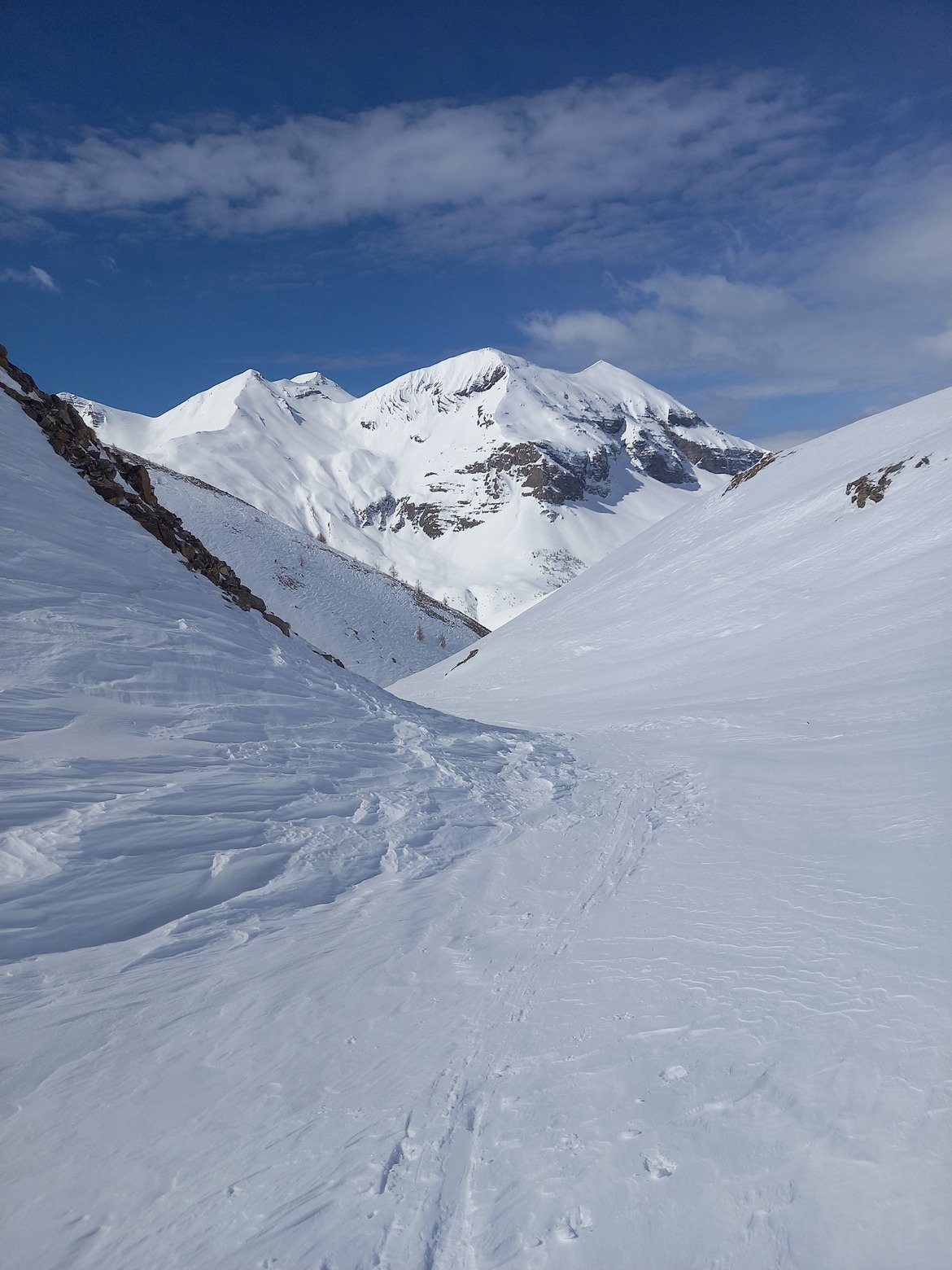 A 150m du sommet, le vent en rafales, accompagné de neige balayée. Nous poursuivons un peu mais comme le soleil semble se cacher nous decidons de descendre, avant de peut-être ne plus rien voir.