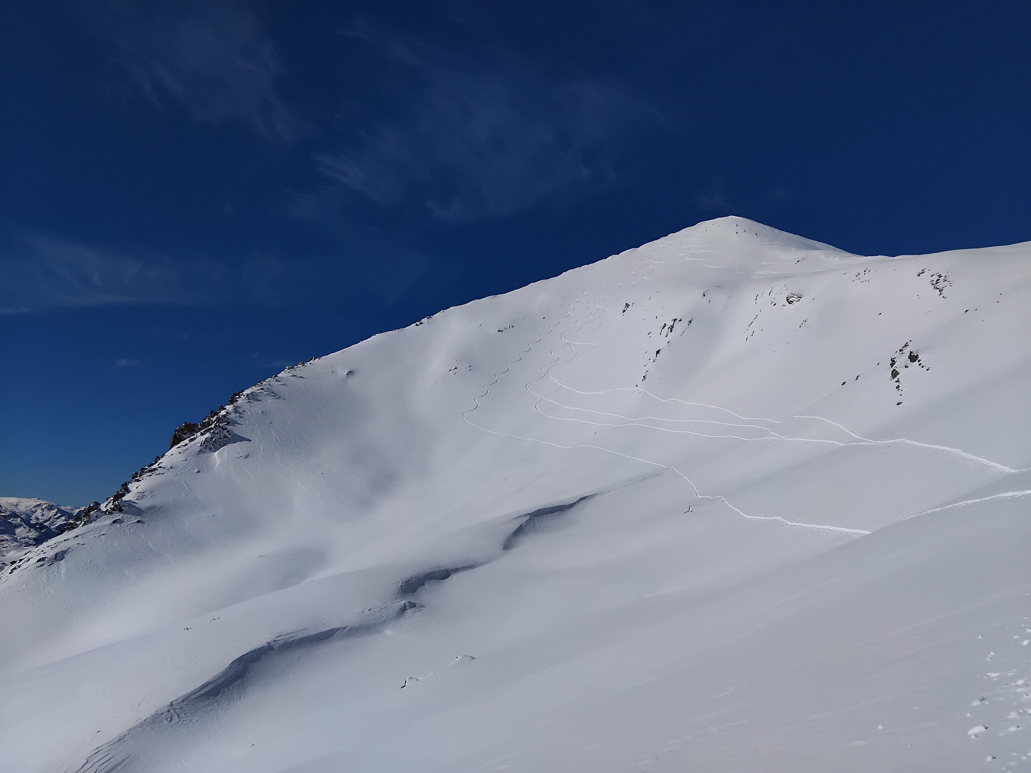Neige changeante pas mal tassée par le soleil et le vent sur le versant sud est, mais qui reste très agréable à skier. Le vallon qui s'en suit à été beaucoup plus travaillé par le vent, mais on arrive a la route tant bien que mal.