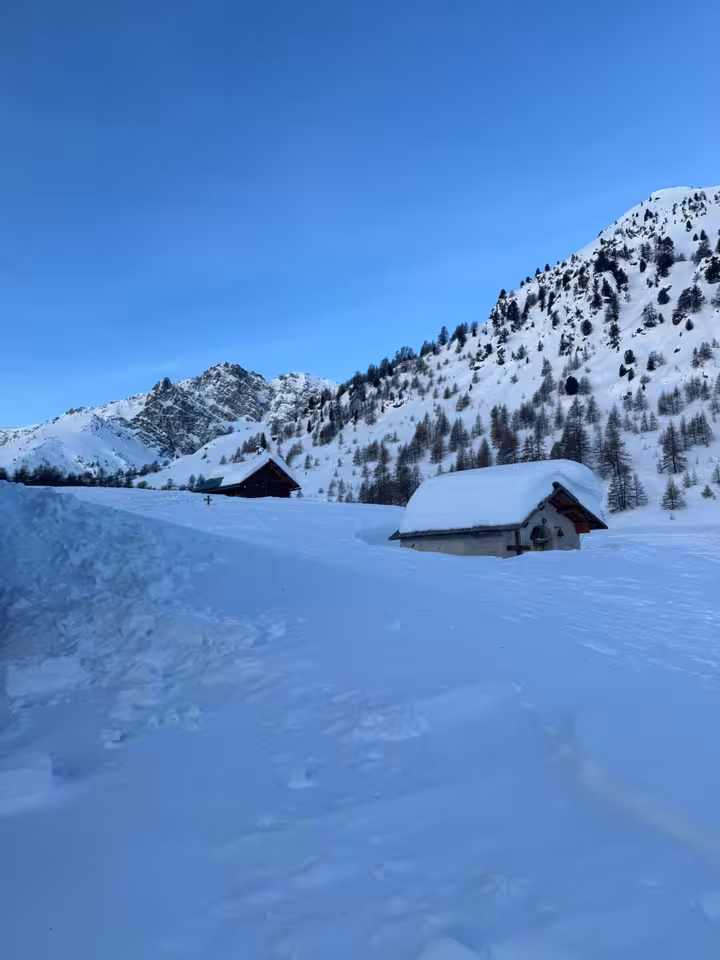 Petite pause à la terrasse du refuge, puis on redescend par la forêt de mélèze, la neige y est particulièrement lourde mais on y trouve de quoi s'amuser quand même grâce aux nombreuses traces.