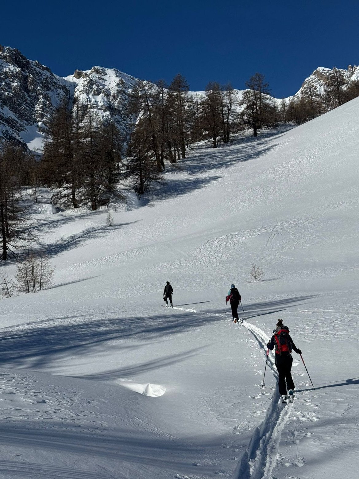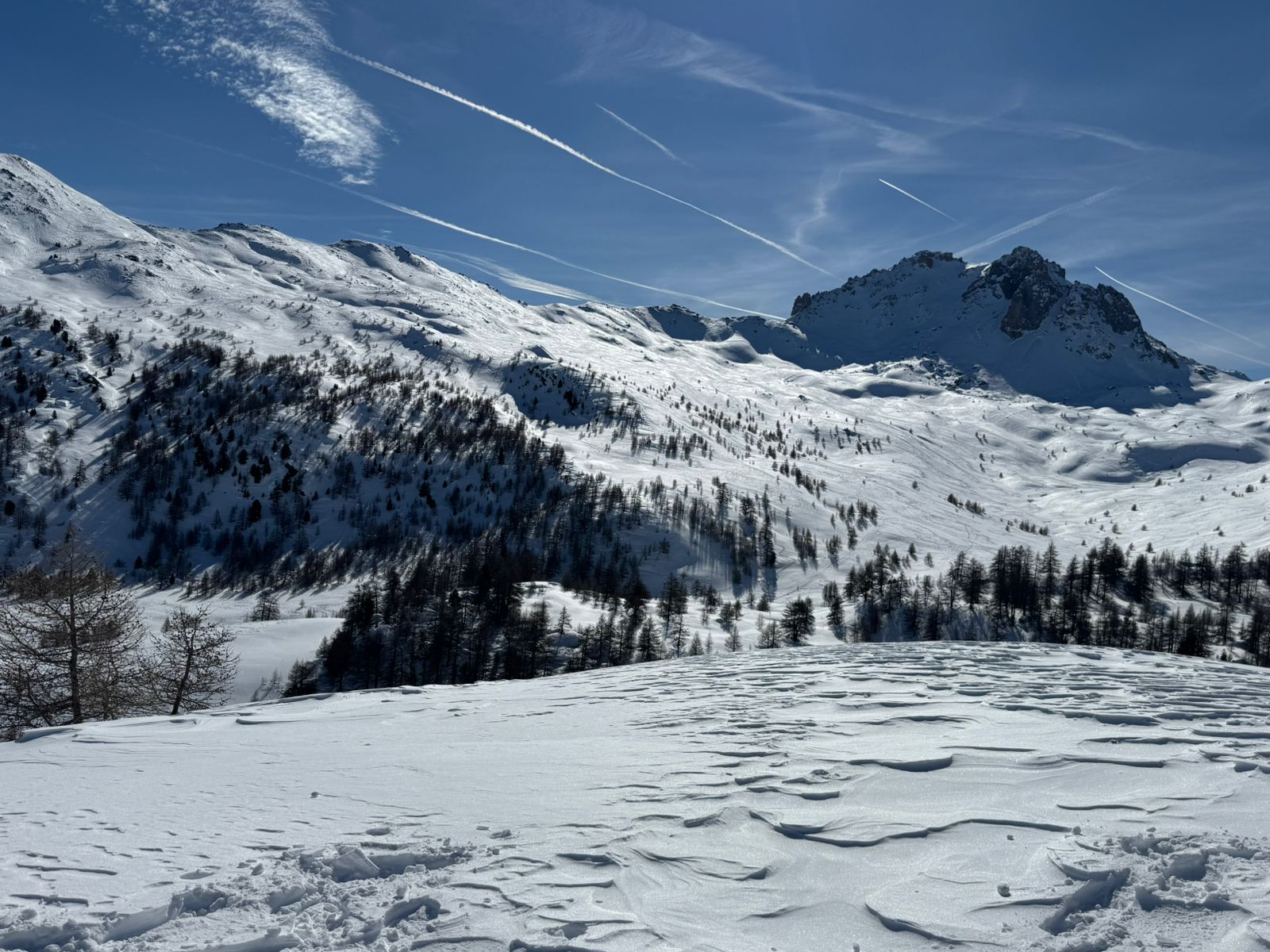 Le soleil tape vite et fort mais en haut la neige reste douce et légère, avant de retrouver une bonne neige de printemps plus bas.
