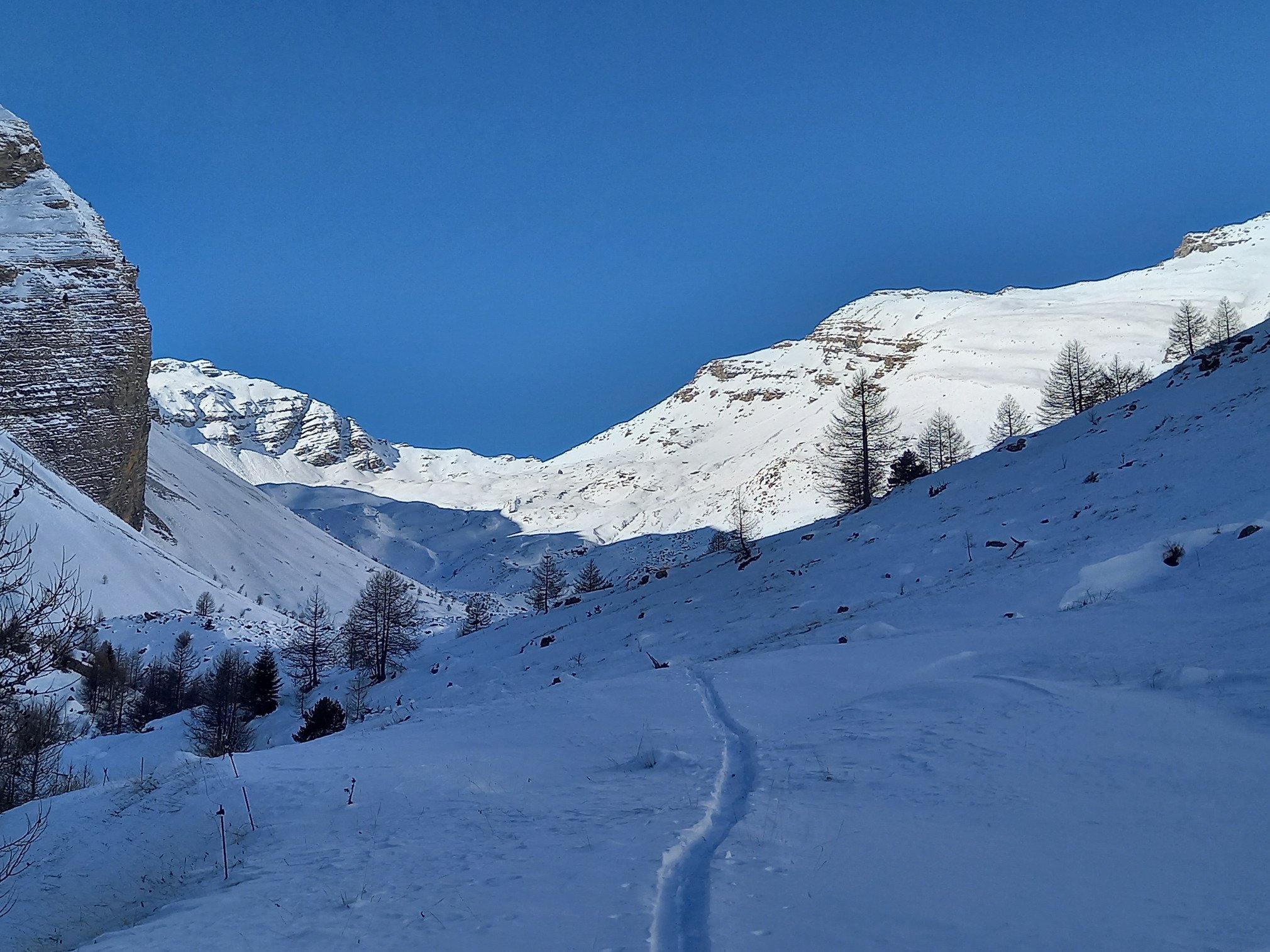 La descente du vallon : catastrophe, puis sous la cascade, le froid et la neige abondante sont de retour, ca glisse jusqu'à la voiture.