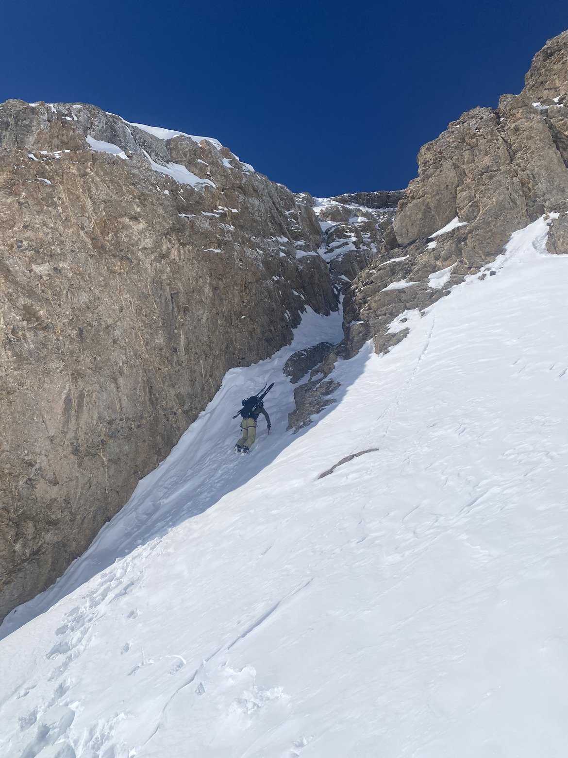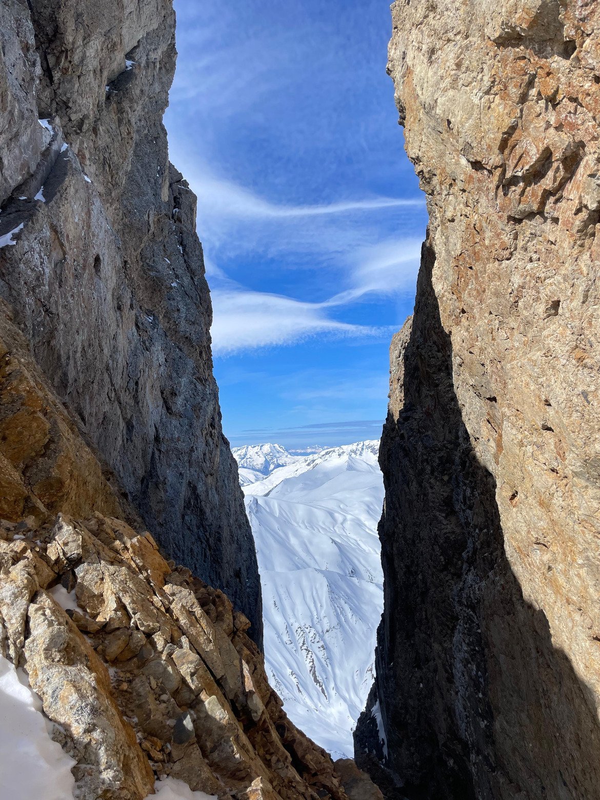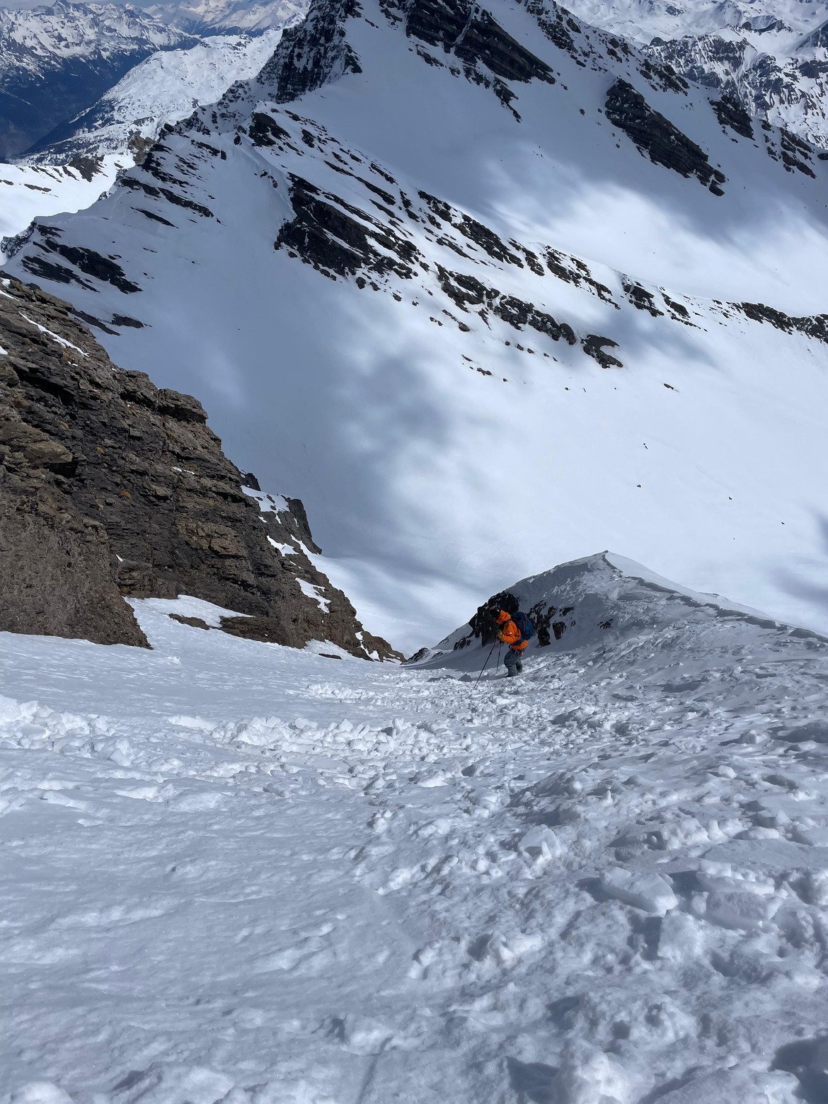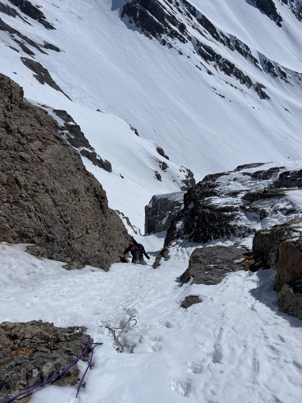 Aujourd'hui, visite au couloir Miaou, sur l'Aiguille septentrionale, surnommée la Tête de Chat. Belle ambiance pour accéder à la pente suspendue avec le franchissement d'une astucieuse goulotte encaissée. Il y avait ce jour deux (courts) passages en glace. Sur la pente suspendue, neige changeante, parfois bonne, souvent croûtée qui chauffe donc assez physique à skier. Ski pas maboul mais belle ambiance.