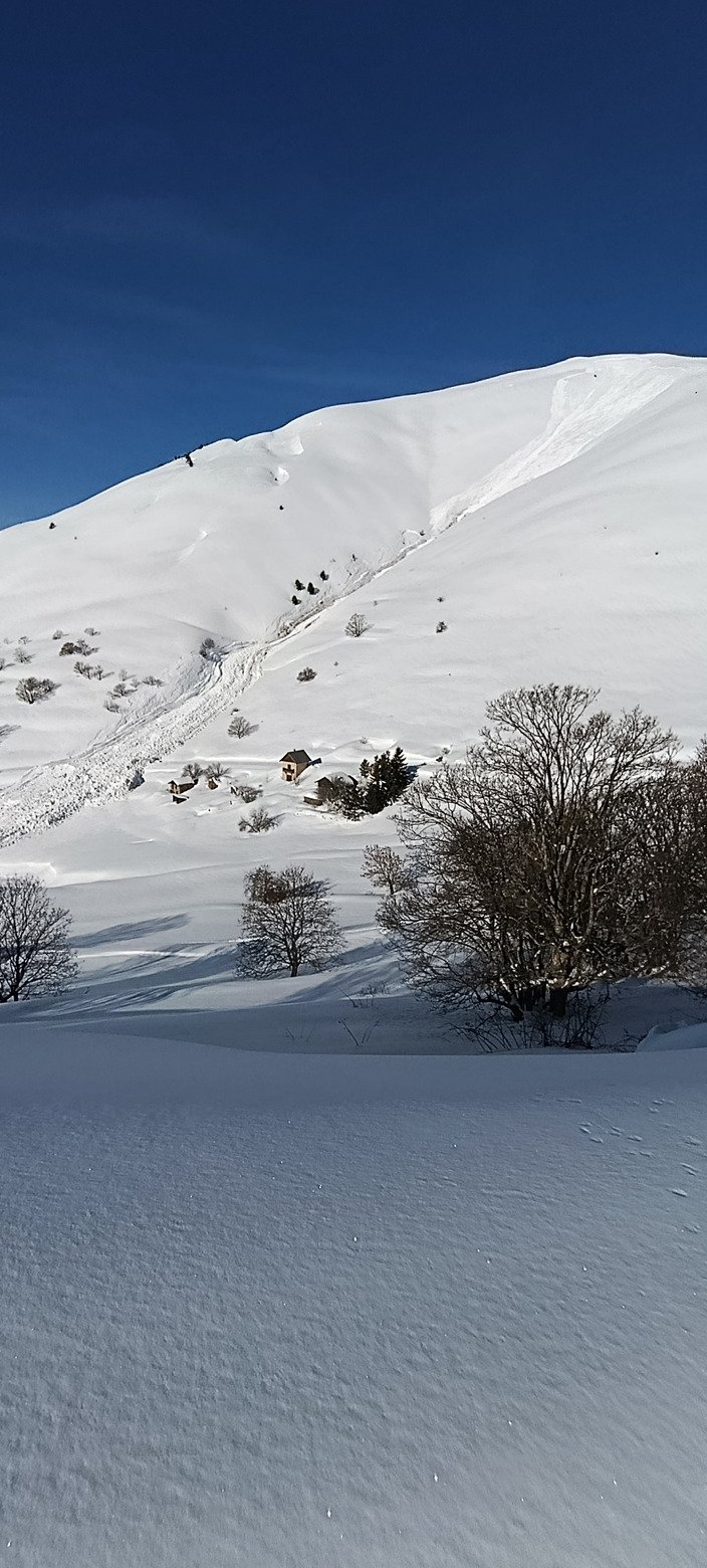 La traversée jusqu' à la chapelle St Giraud se passe bien avec parfois les skis qui se coincent. Arrivé vers le hameau de Cluy, le spectacle est impressionnant. Hier soir, les services des pistes ont sécurisé la route en déclenchant l'avalanche depuis l'hélico. Toute la combe Giraud est partie. Aussi impressionnante que pénible à traverser. La suite se passe sereinement, sous le vent , jusqu' au sommet. J'avais espéré que la neige allait s'améliorer avec l'altitude: C'est raté. La descente est une horreur. Du ski combat en stem, avec 2 belles baignoires.
