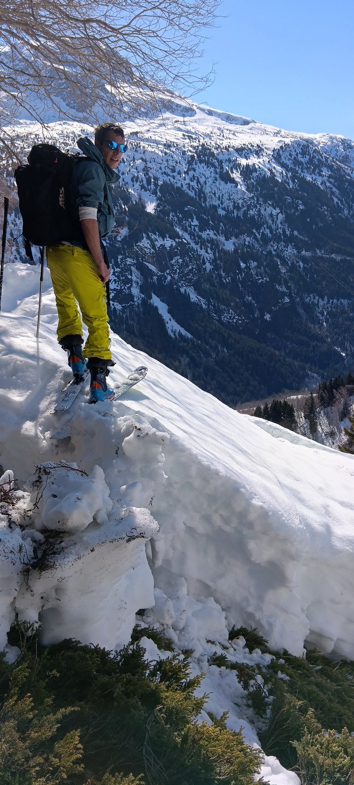 Nous nous sommes arrêtés une cinquantaine de mètres de dénivelé sous la Brèche, dont l'accès est barré par une impressionnante corniche. Malgré une entame de descente vers 11h20, la neige est restée très correcte. On s'est bien fait plaisir sur les deux tiers supérieurs (de 2400 à 1700 m d'altitude en gros), sur une neige entre moquette à poils longs et transfo lourde bien skiante, mais toujours rapide. En-dessous (quant on rentre dans la forêt), le manteau est bien pourri. C'est une bonne neige à se faire un genou, très lourde et même collante sous 1600 m. Mais comme il n'y avait aucune trace ou presque, ça se skiait facilement malgré tout, avec mêmes deux trois ruptures de pentes (ou plutôt de petits talus) bien ludiques.