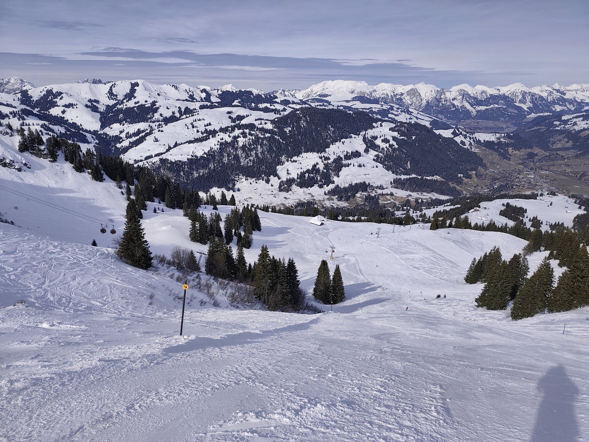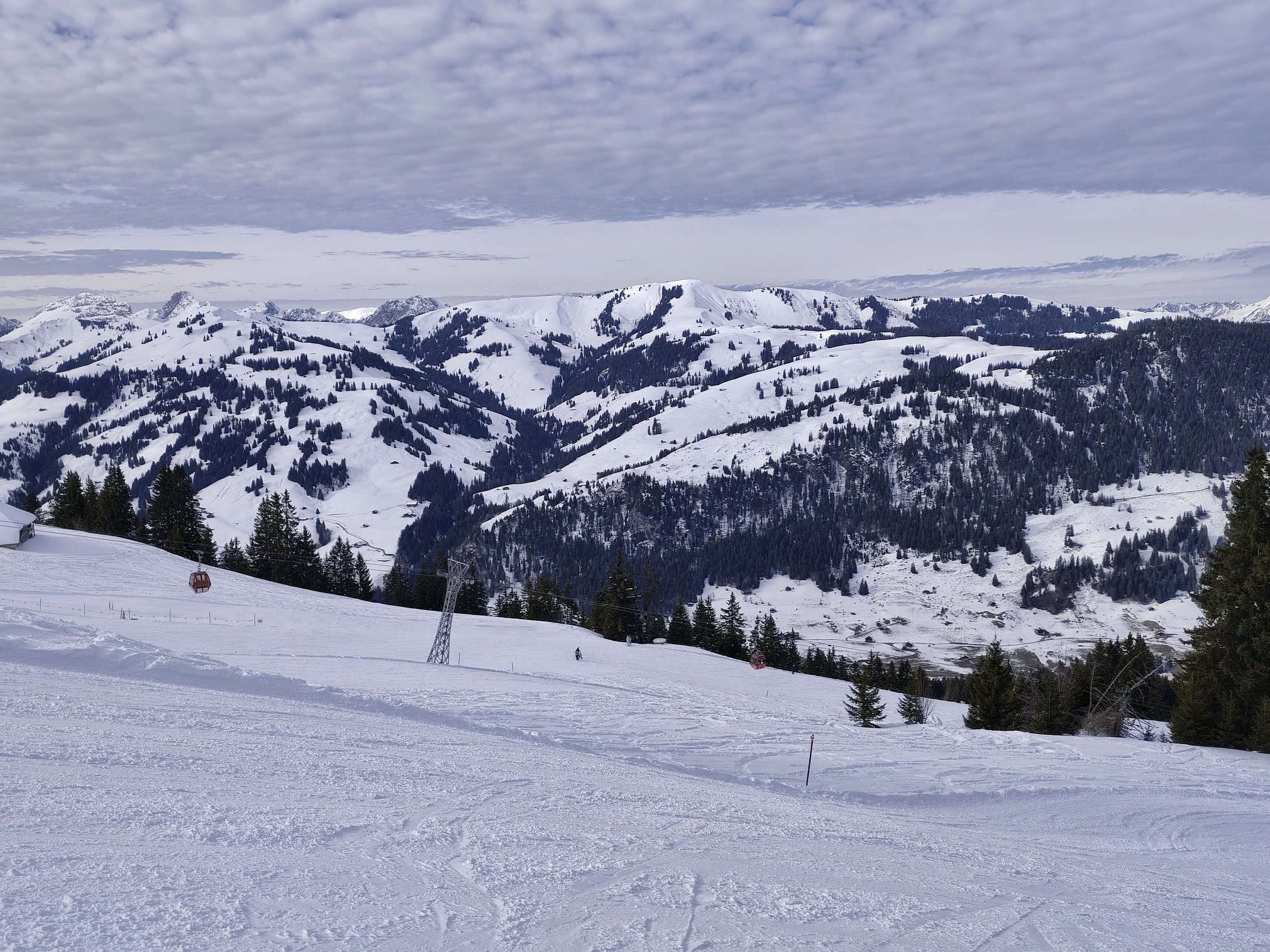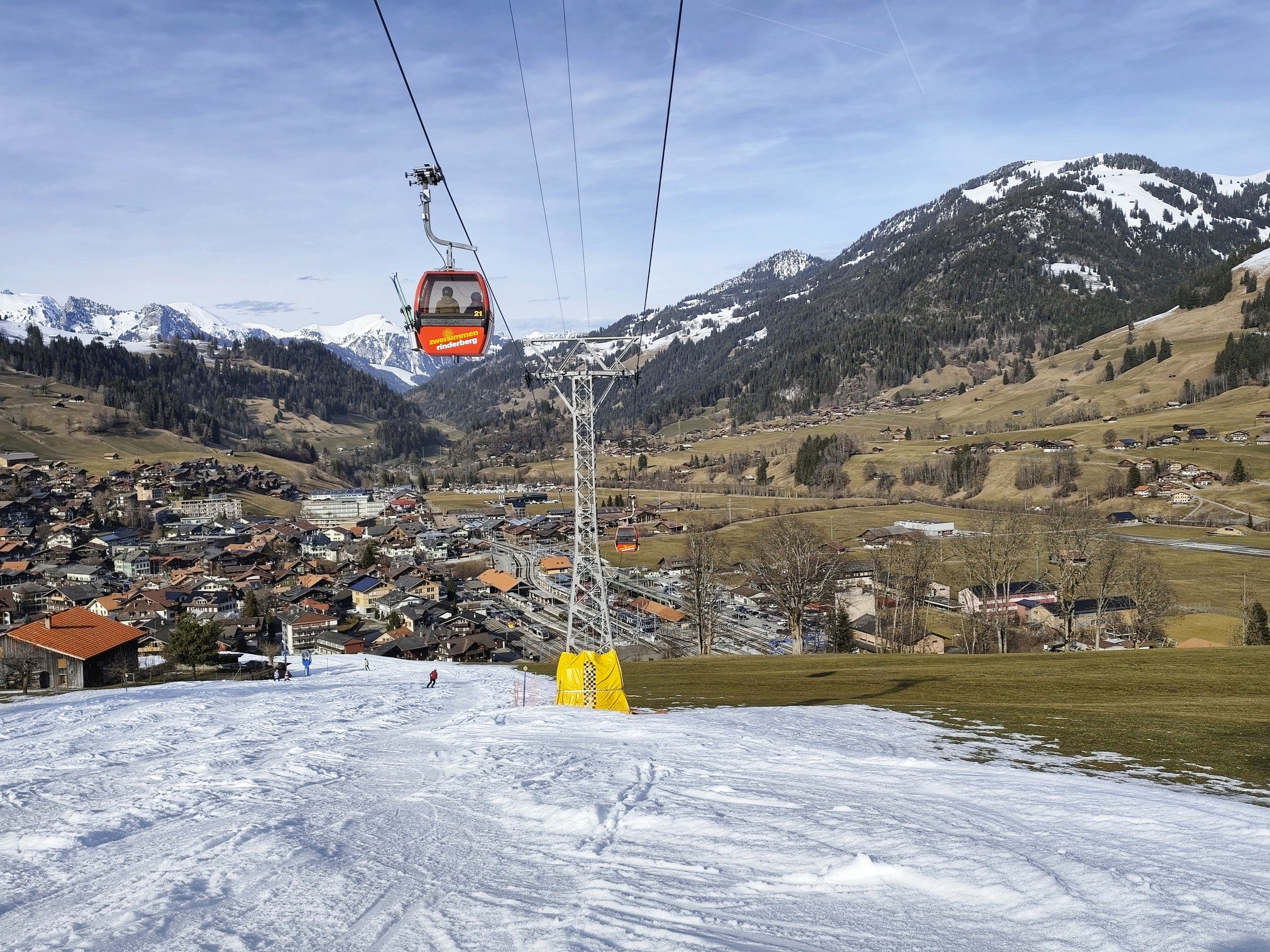 Une bonne demie heure d'attente pour accéder à une télécabine et nous prenons un peu de hauteur. Le simmental est totalement vert, la neige est présente en quantité uniquement sur le haut du domaine.