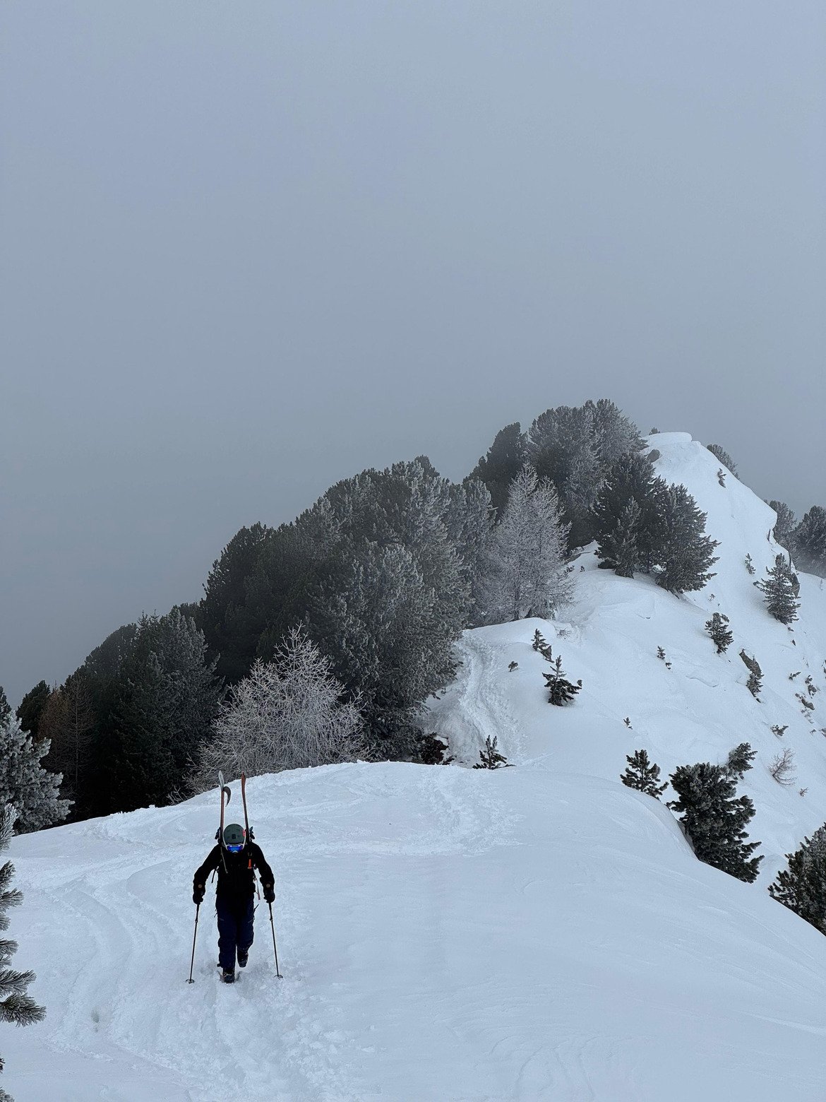 Les conditions étaient étranges: au lever du jour je vois le soleil, puis la mer de nuages remonte donc nous pensions passer au dessus, mais non! il y a en fait deux couches de nuages et le run de la dent de nendaz est dans la purée de pois. On attendra une heure avant de trouver un créneau à peu près acceptable pour se lancer dedans.