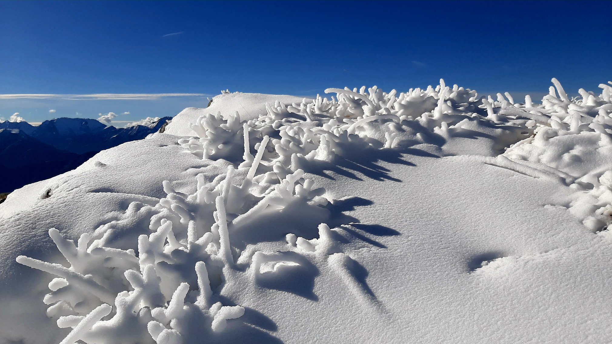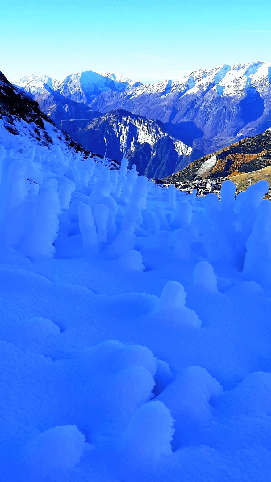 Dans le rayon d'action des canons à neige : des sculptures glacées apparaissent. Les herbes congelées se transforment en boursouflures comme des choux fleurs ou des cristaux ou des pénitents de glace. Juste sublimes.