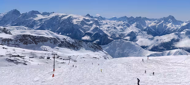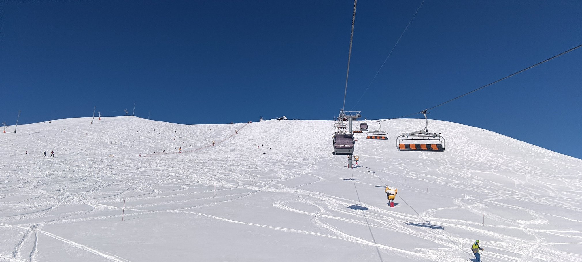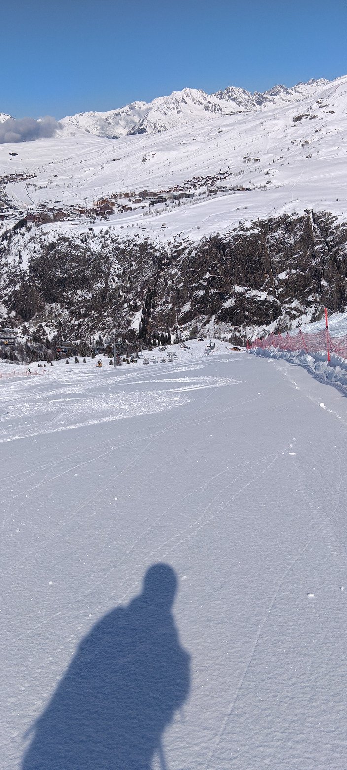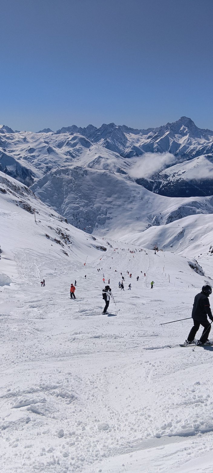 Je vais prendre le DMC (enfin Pic Blanc 1 désormais), et là c'est l'horreur : 20 bonnes minutes de queue ! Du coup j'arrive au "vrai" Pic Blanc quasiment 10 minutes de retard sur mon créneau de réservation. Je demande quand même à l'employée si je peux y aller, et aucun souci, ouf ! J'attendrai tout de même encore quasiment 20 minutes, sachant que ç'aurait été pratiquement le double sans réservation. Bref, le trajet de la station au Pic Blanc m'aura pris quasiment une heure. Que je regrette l'époque bénie où il y avait de vraies périodes creuses entre les vacances, y compris dans les grosses stations ! Aujourd'hui, il y avait aussi bien des jeunes adultes français que des Slaves, des Belges, des Anglais, des Espagnols... Bref une belle tour de Babel, avec un niveau de ski d'ensemble plus proche de Jean-Claude Dusse que de Marco Odermatt 😁, mais une ambiance détendue et pas de skieurs évoluant au-dessus de leur niveau. Il faut dire qu'ils étaient bien freinés par les paquets de neige sur les pistes 😆
