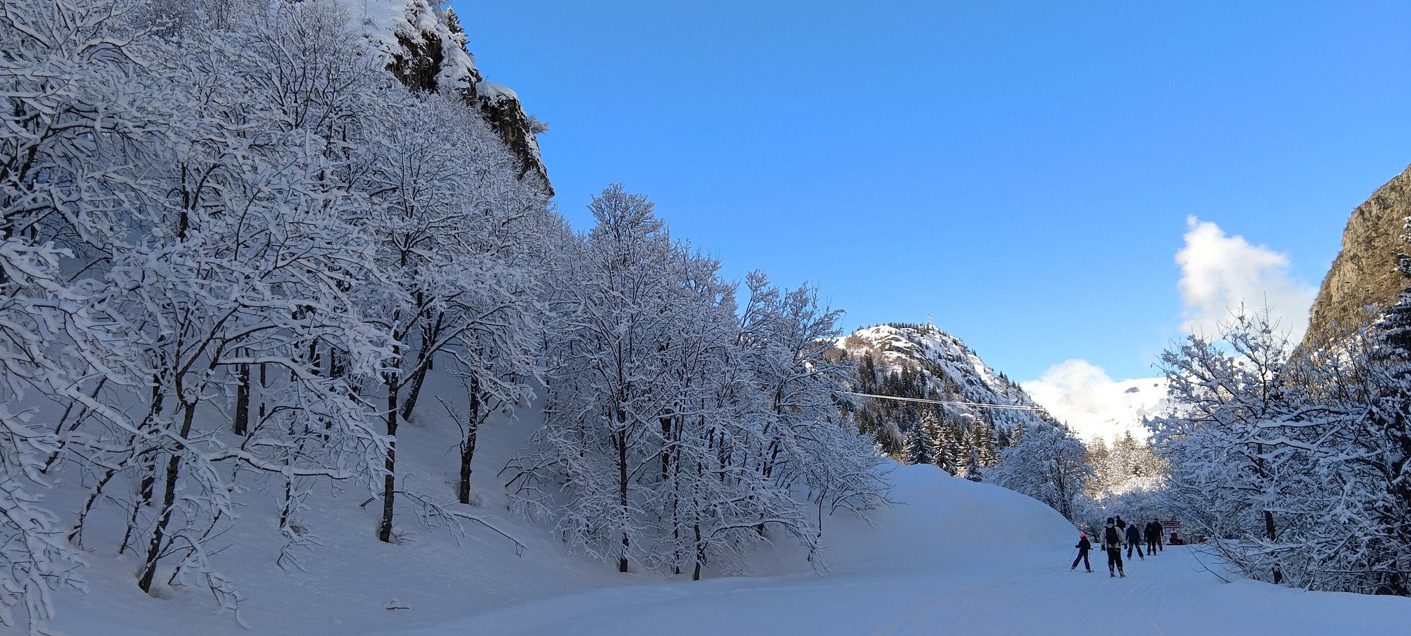 Sauf que je me suis bien planté : il a neigé plutôt 15 à 25 cm selon les endroits, et certainement jusque tard dans la nuit (voire tôt le matin), si bien qu'il y a peu de pistes bien damées. La plupart du temps, une belle couche de fraîche (froide et légère au-dessus de 2100/2200 m) recouvre les pistes, vite traffolées avec les nombreux passages (j'y reviendrai plus tard). Bref, très clairement, mes Backland 95 ou mes Scott Pure 102 auraient été nettement plus adaptés aux conditions du jour. Tant pis, je skierai un peu plus à cul que d'habitude 😂