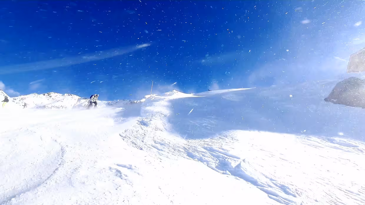 Piste Cristaux et son vent glacial a la 1ère descente ! Neige dure et des coins en super neige legere extra a rider déposée oar les transports de vent.