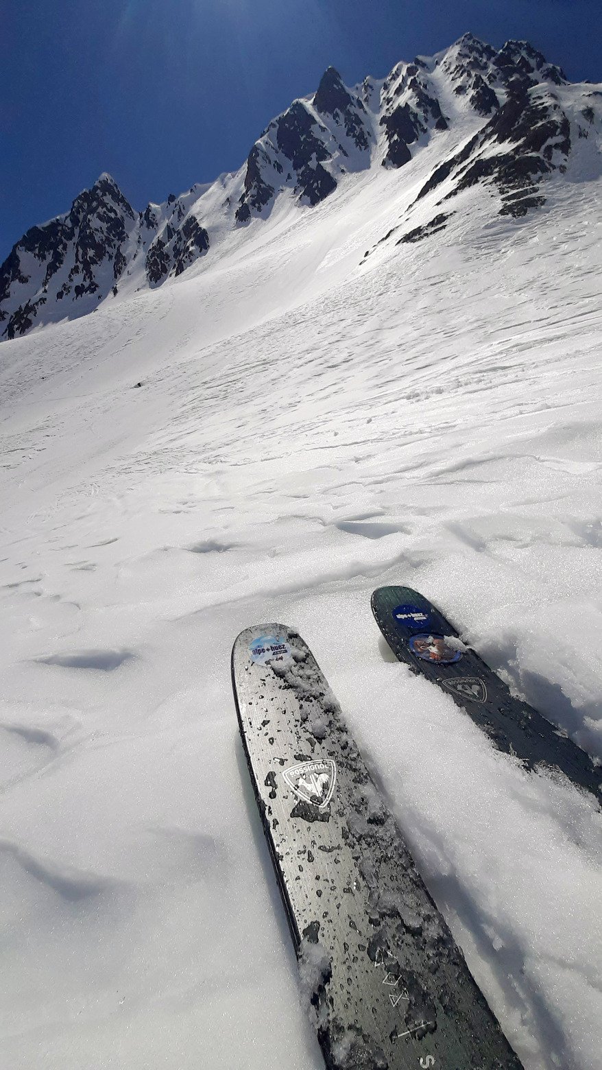 Côtes Rivet est tentant, c'est déjà bien transformé voire limite collant sur les secteurs de traversées. Le meilleur ride se trouve dans les combes bien lisses. La glisse passe nickel. Et dans les secteurs exposés le plus tardivement au soleil ! Comme dans le canyon ! Encore super bien enneigé, il y a de quoi se faire plaisir ! Avant de rejoindre la piste de Sarenne juste avant son dernier mur déjà bien bosselé en petit sel de printemps. Le chemin des gorges fait cramer les cuisses, car en mode scotch sur certaines coins !