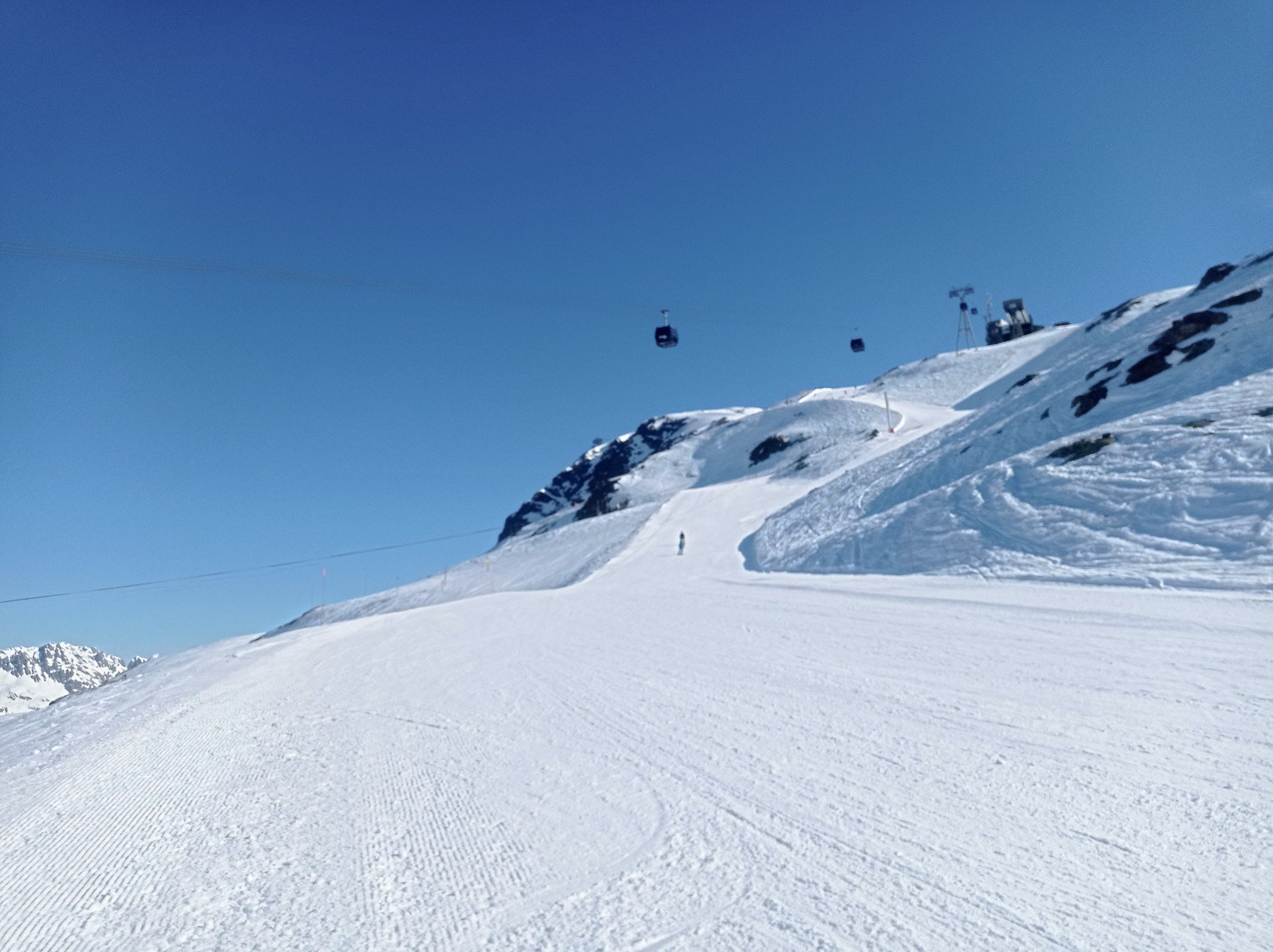 En haut de pic blanc 2 c'est plutôt très bien avec une neige bien froide mais pas congelée. Descente par les chamois extra et avec peu de monde. Je file vers oz, en bas de la piste chamois et traverse le domaine piétons du lac besson. Une belle idée de ballade avec les belles journées qui arrivent cette semaine. Plus bas sur Oz, c'est un coup zipette, un coup boulettes et un coup ça colle mais bon il y a vraiment un bel enneigement pour la saison.