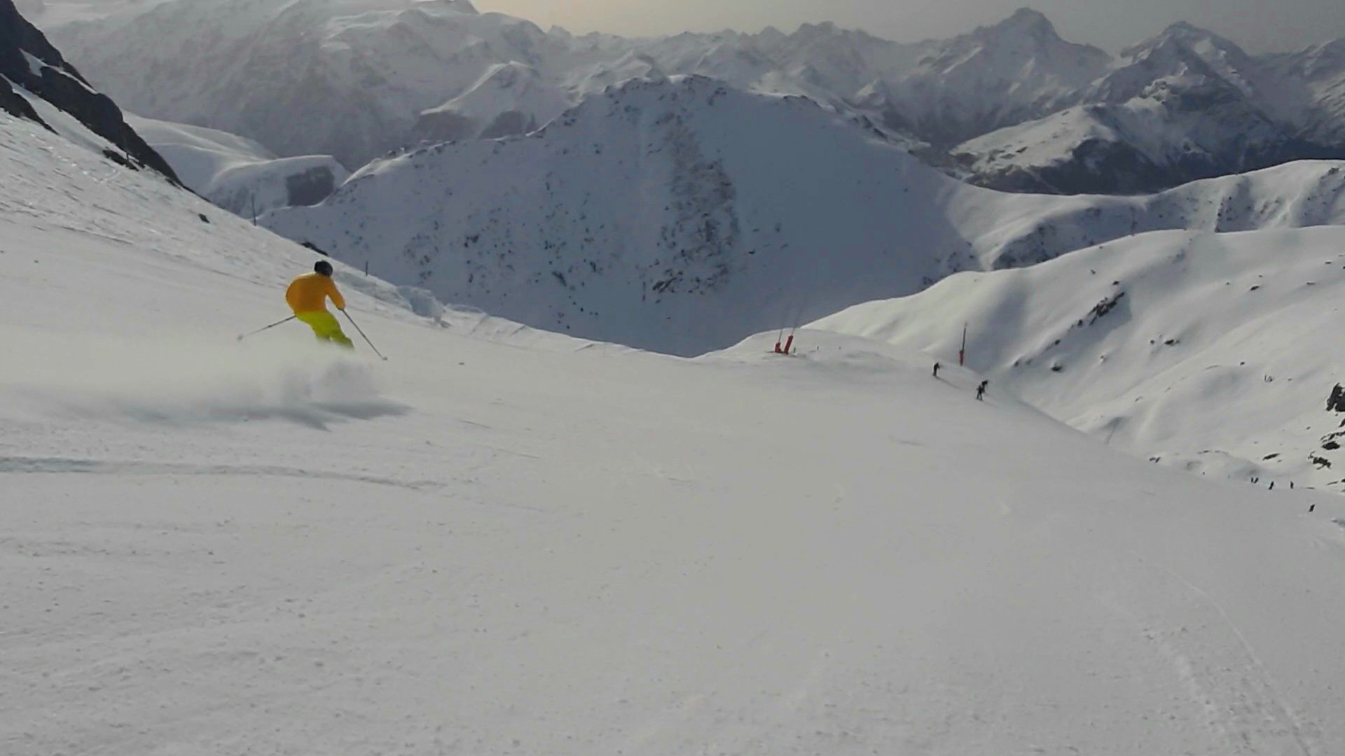 Après 3 runs en fin de matinée, c'est le bon timing pour rider sur la décaillée sous la ligne du télésiége de Chalvet. Il faut en profiter car la neige est extra et encore une bonne épaisseur. Avec une vue époustoufflante sur la Muzelle qui surplombe de façon sublime, en arriére plan, le Col de Cluy. Le Rochail, le Grand Renaud sont de toutes beauté.