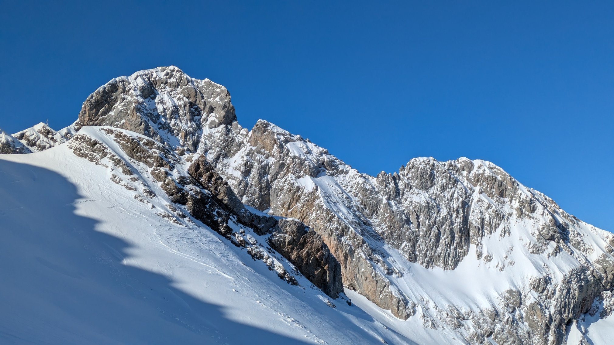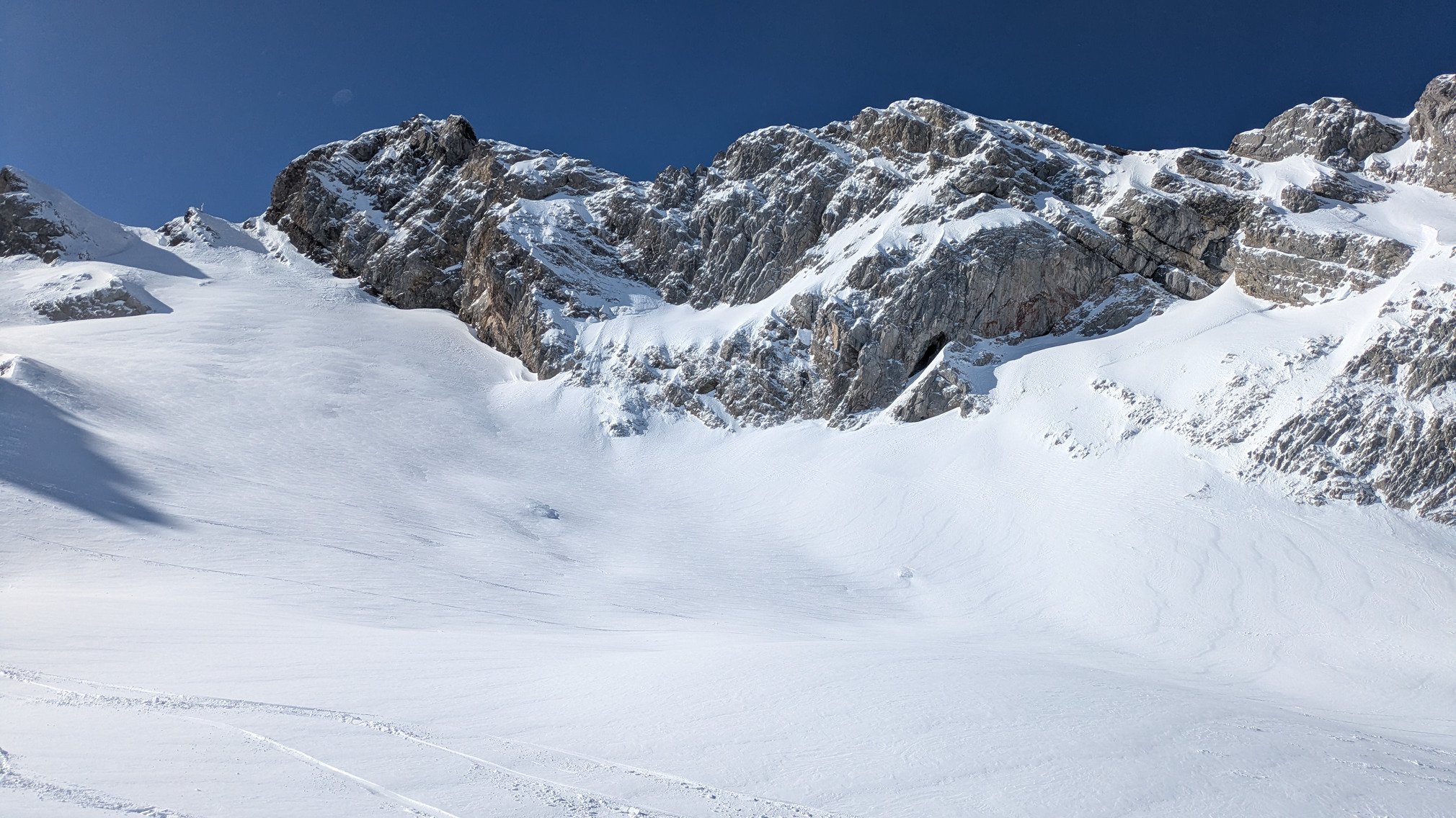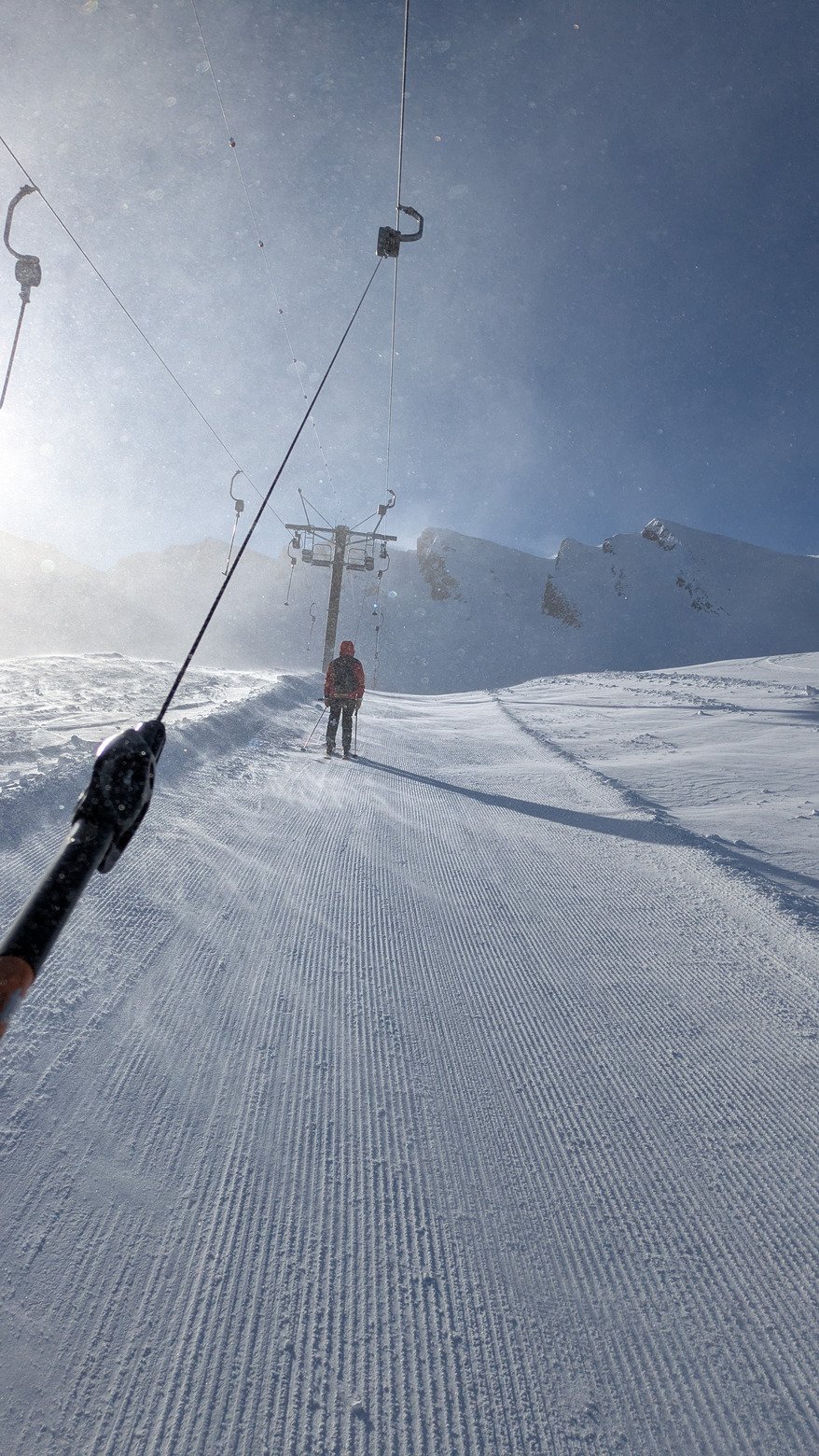 Le vent fort des dernières heures a été l'allié de circonstance aujourd'hui : chasse aux nuages, neige fraîche transportée dans les combes recouvrant les traces des affamés de la veille.