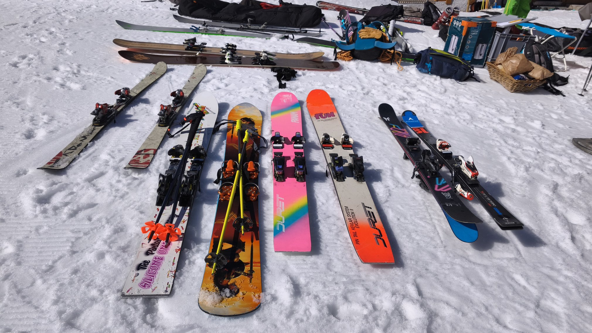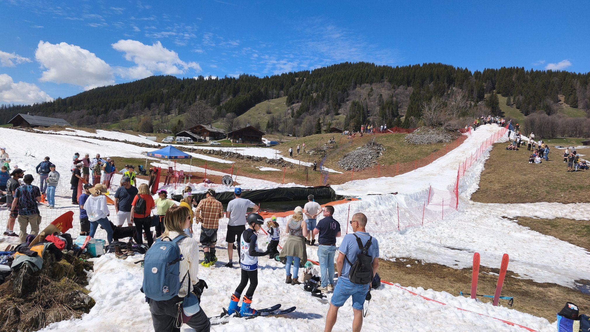 Petit tour par bella cha a 13h30,c'était une bonne heure trop tard (ça c'est le temps de comprendre commebr faire tourner un monoski !) de la glue en bas,et ça resserrait déjà en haut à l'ombre. Ski au pied jusqu'au lac qui se prépare pour demain,et la piscine pour les kidz a côté !