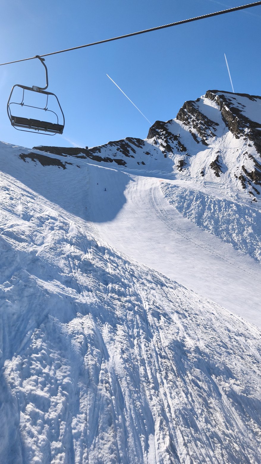 Le domaine est quasi vide,en conditions très printemps : neige très dure le matin ramollissant vite sur les plats,lentement à l'ombre.