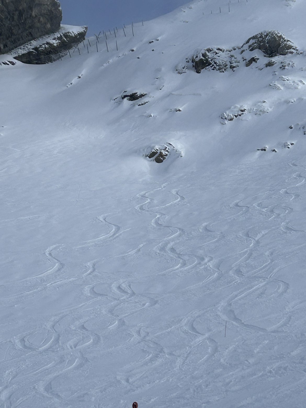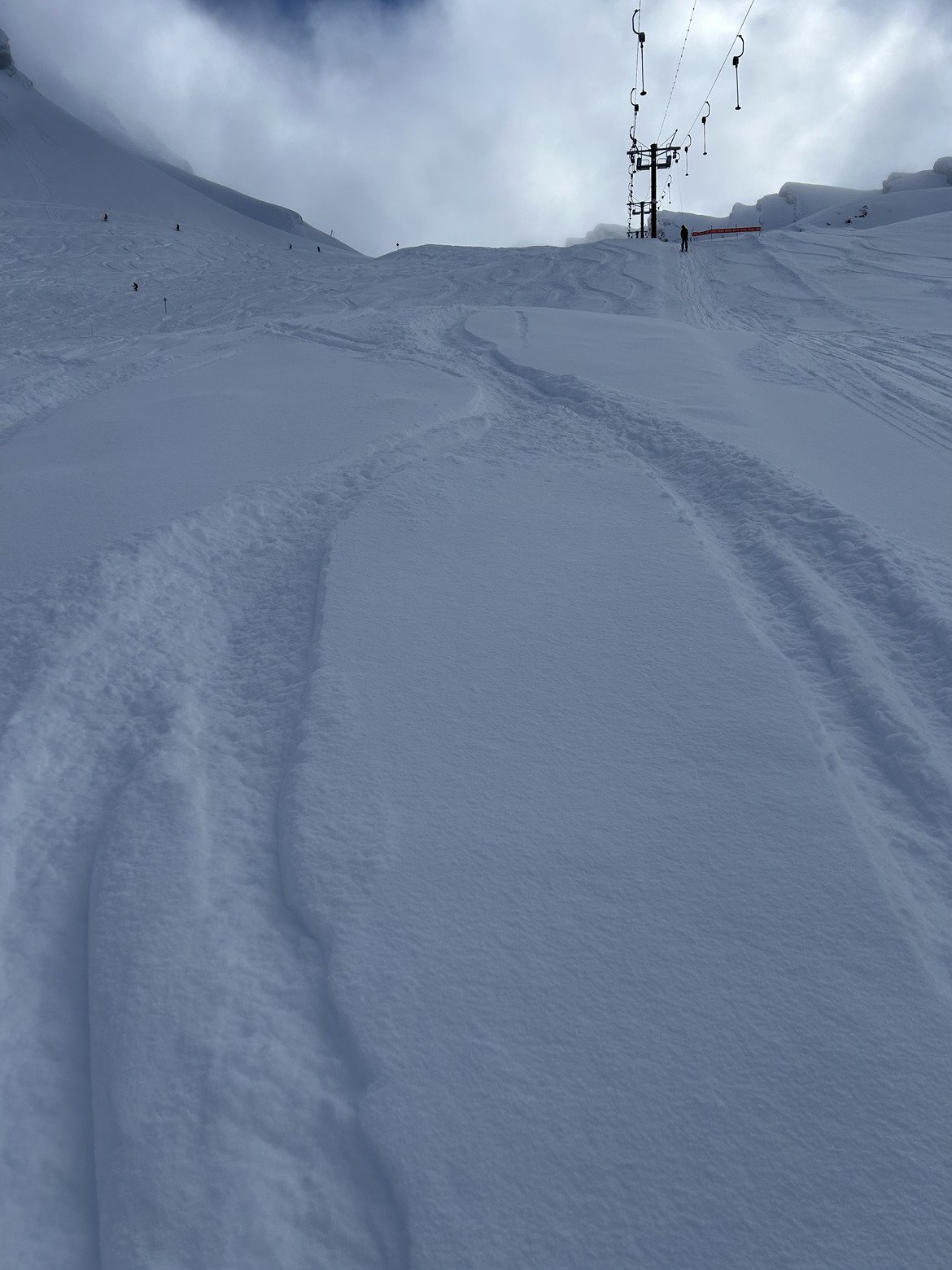 HP bon :15-20 cm et parfois plus, de poudre légère non ventée sur fond ferme et parfois un peu irrégulier,mais globalement très bon.