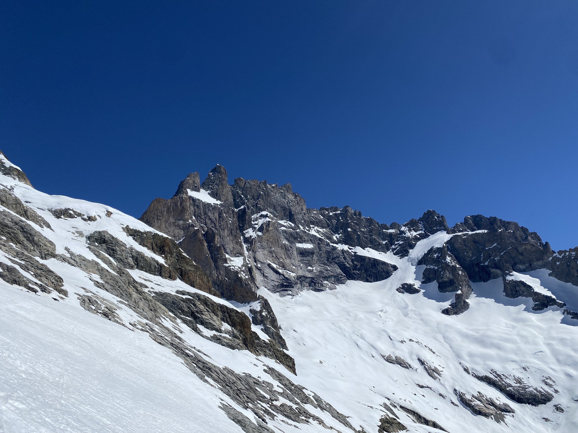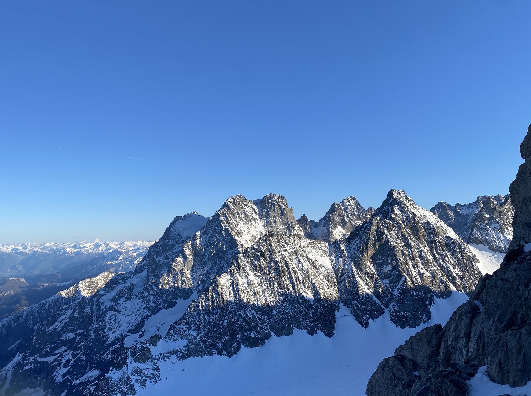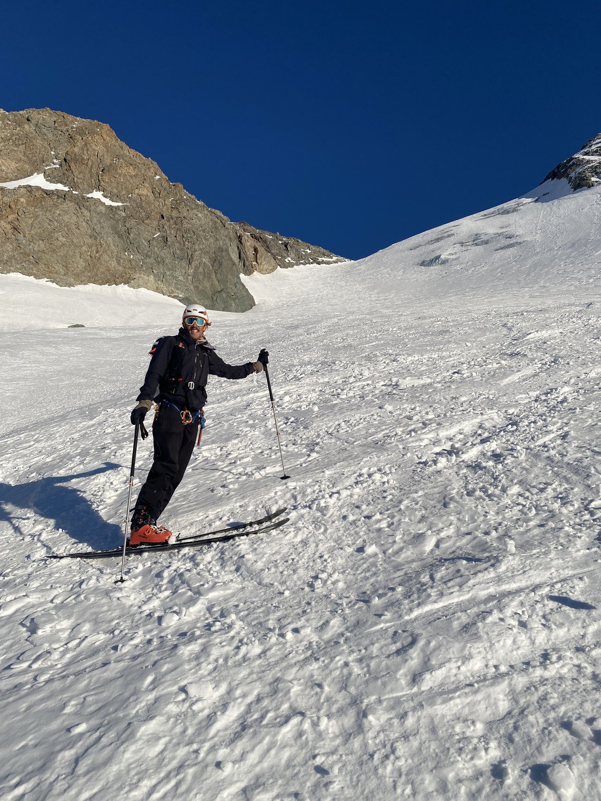 Retour dans les Ecrins : départ la Grave cette fois-ci, avec un cheatcode télécabine qui nous permet de commencer à sortir les peaux à 3200. On file direction le col de la Girose pour attaquer la première descente de la journée, par le couloir qui donne côté Vallon de la Selle. Il est 10h, et c'est complètement béton et raboté par les traces de dérapage : on ne fera pas beaucoup mieux, moins d'une dizaine de virages pour arriver en bas, la perspective de sauter inopinément la barre inférieure nous tentant assez peu.