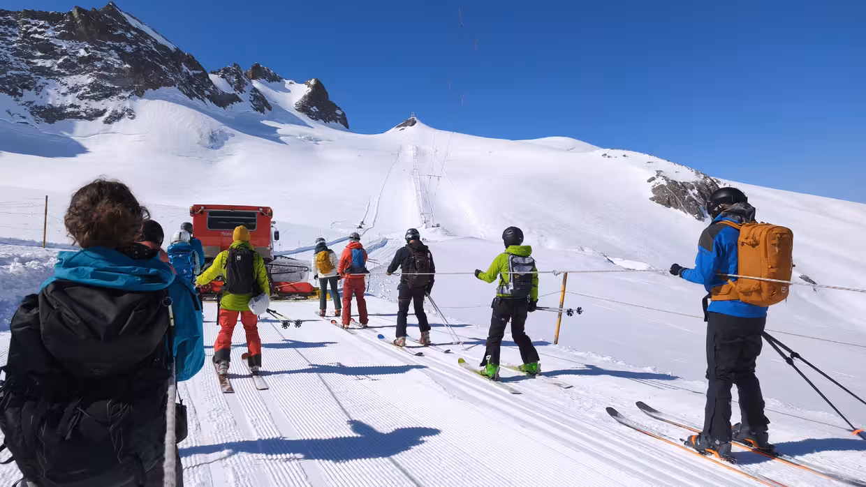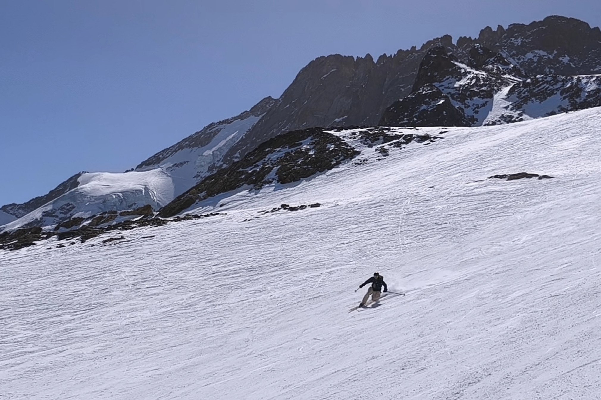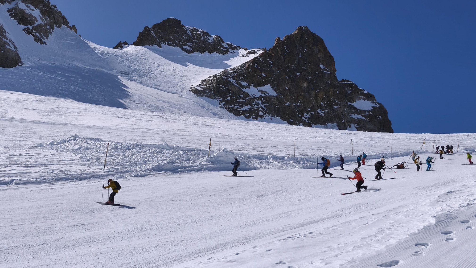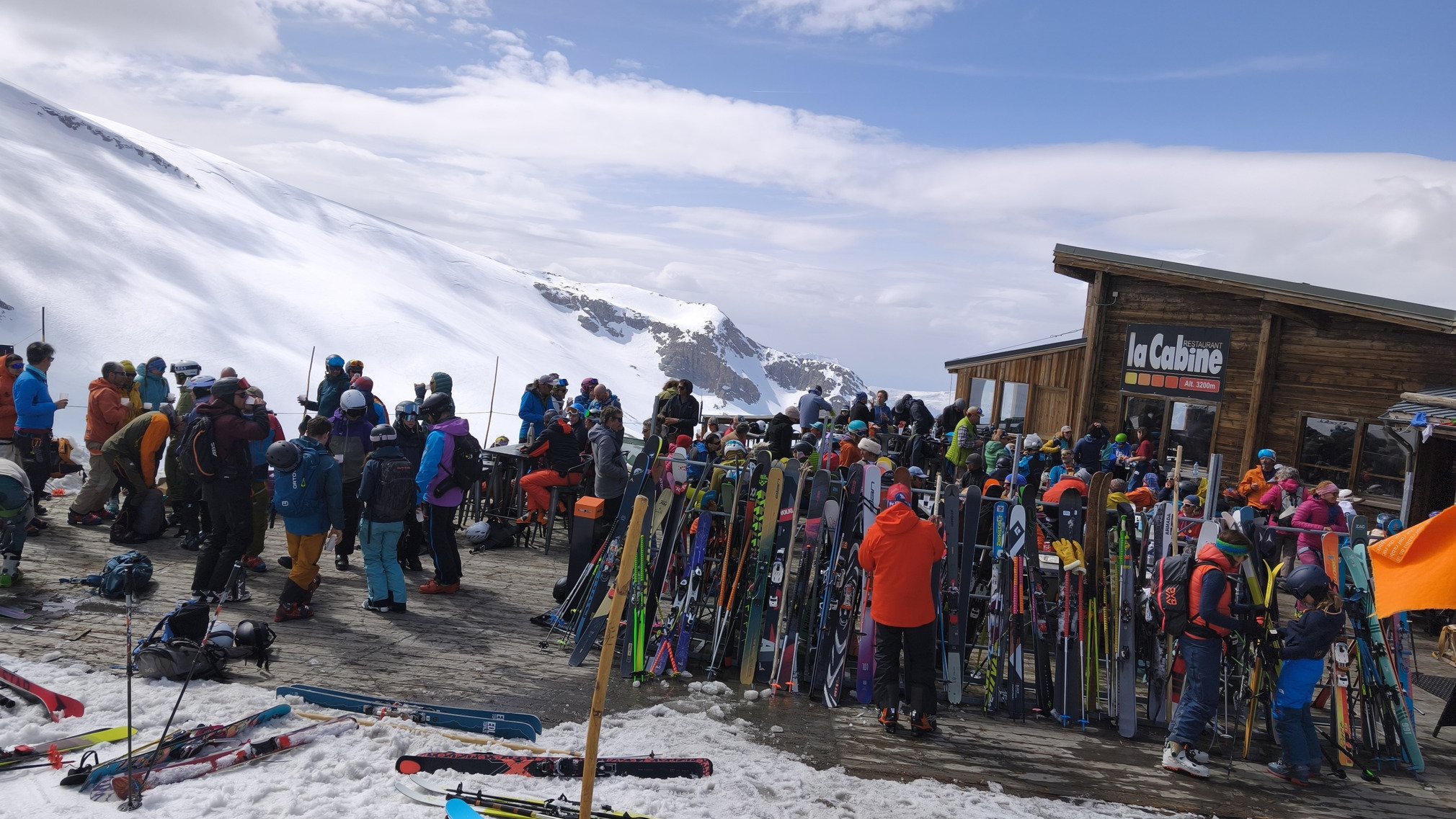 Grand soleil à la grave,ou la haut c'est encore un peu l'hiver! Les conditions sont printanières, avec un léger regel qui decaille rapidement au soleil pour une bonne neige ramollie,sans devenir soupe.