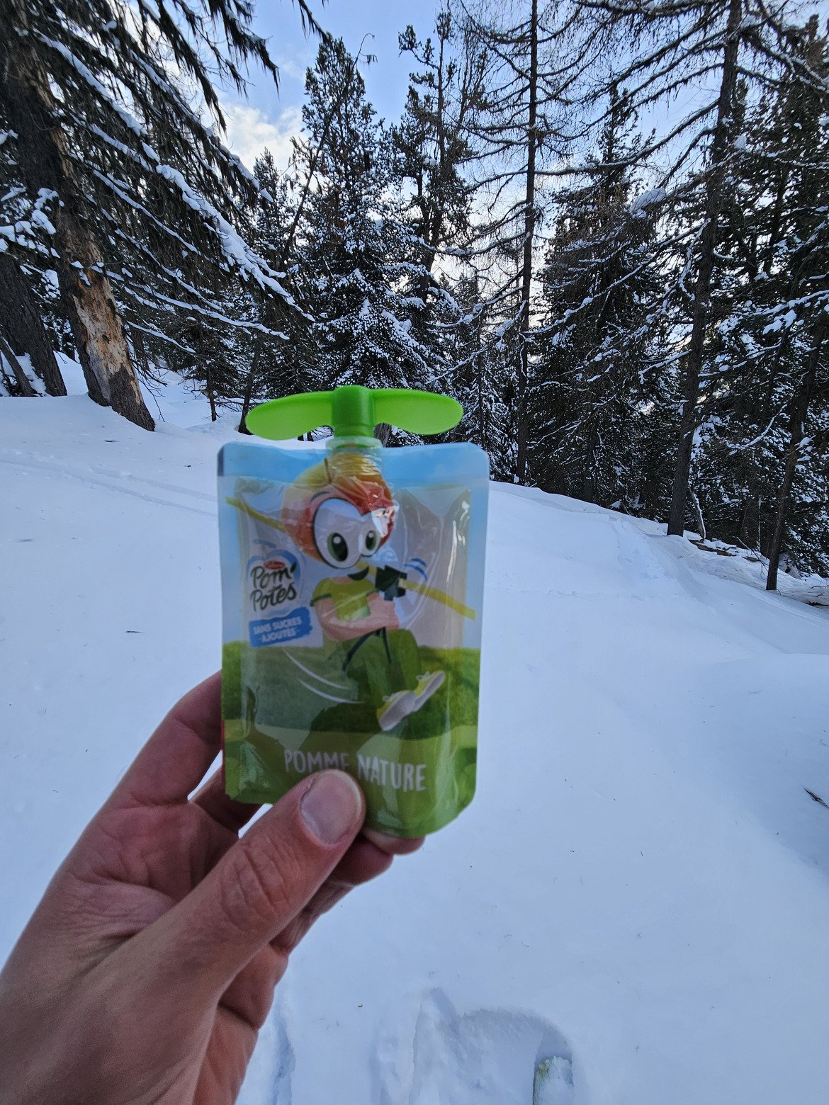 Mort de faim, le copain me propose d'aller dans la forêt. OK. À ses risques et périls. C'est assez espacé pour proposer des virages. On s'en sort pas si mal. Jusqu'à ce qu'il se viande une fois, deux fois... je le laisse galérer dans les branches pour rechausser, pendant que je prends ma pause Pom'potes. #onlyfreeridecanjudgeme