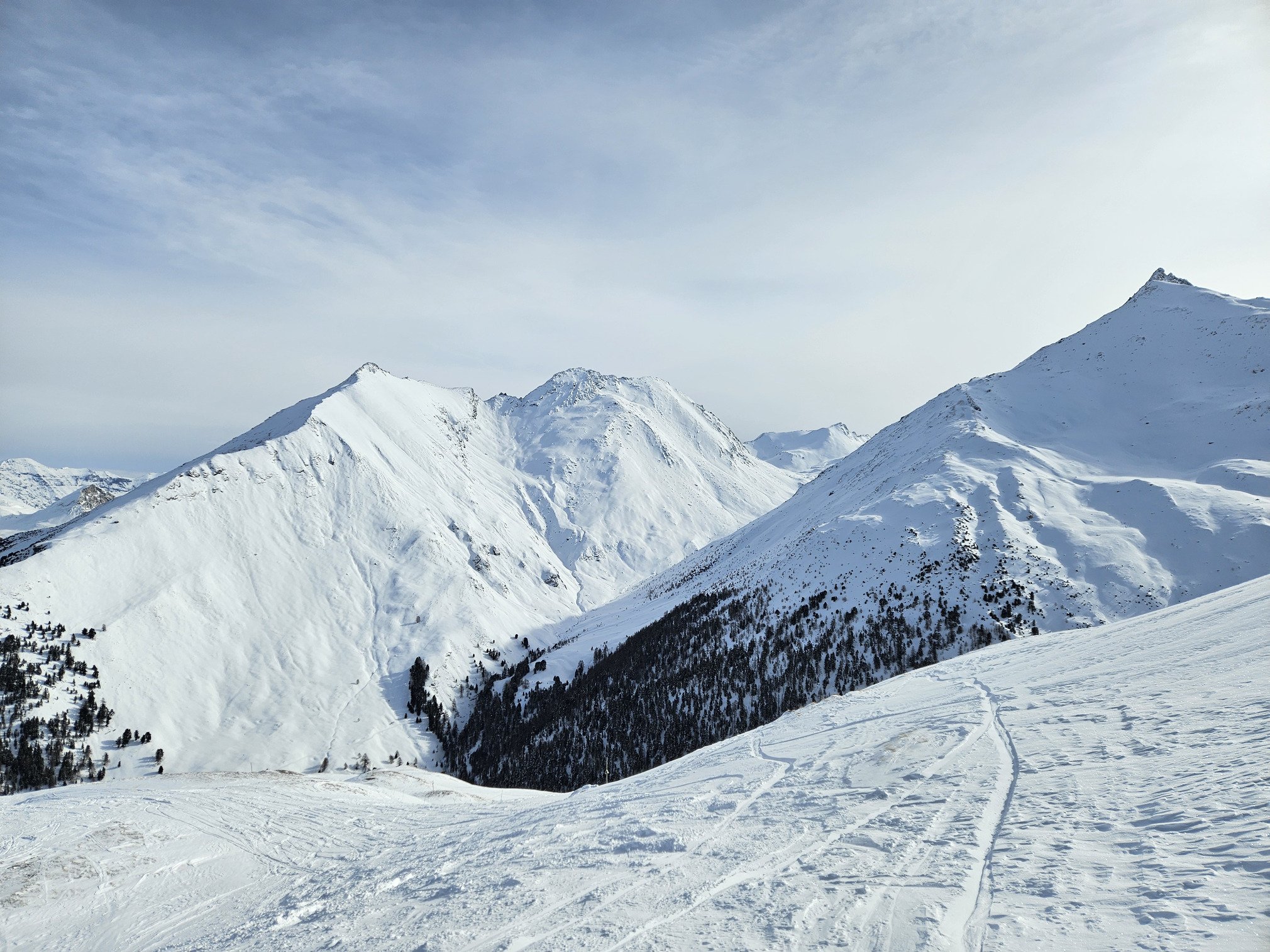 Mais surprise ce matin en haut du domaine : un bon 20cm de neige, parfois légère, parfois ventée et compacte.