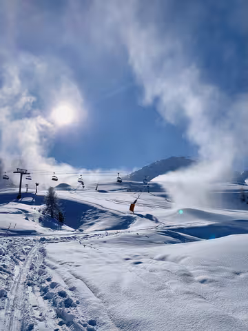 Plus bas près des villages, les canons à neige dégueulent fort et il se forme une petite croûte, mais très légère et qui n'enlève pas grand chose au plaisir de la journée.