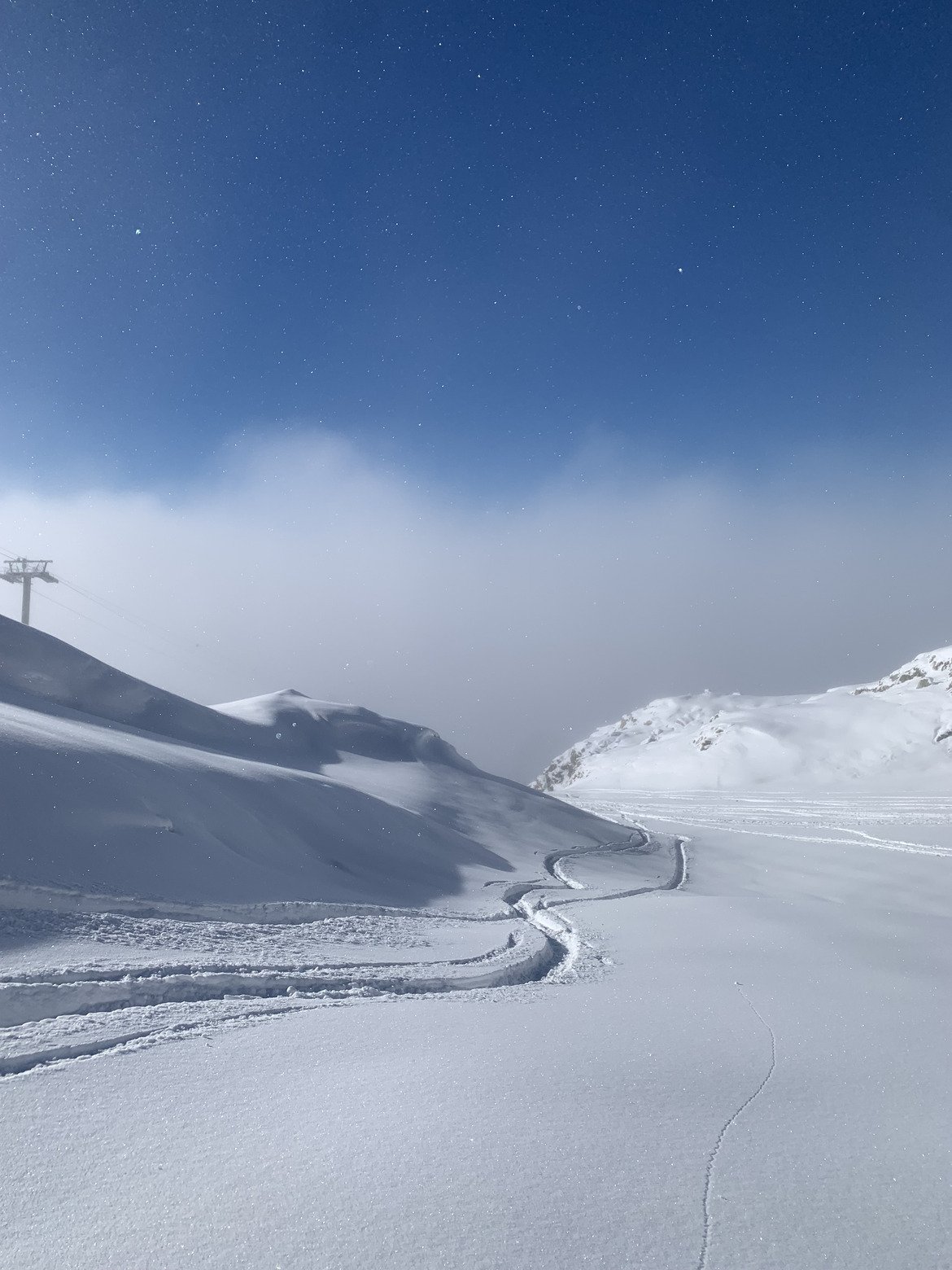 Le froid conserve bien la neige et l'intégralité de la descente se fait en poudreuse. Les tracés des pistes sont déjà un peu trafollés, mais il y a toujours moyen de faire une petite trace.