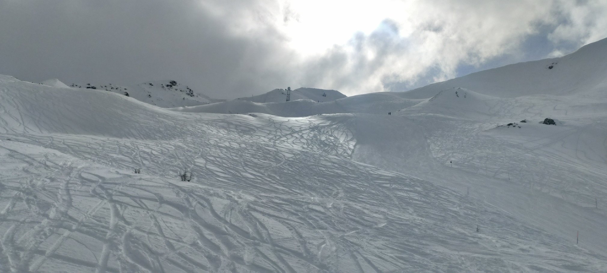 Je suis tout de même allé tâter un peu de hors piste, en recherchant paradoxalement les zones déjà limite traffolée... car avec mes Atomic Redster SX de 70 au patin, je me voyais dans les 40 à 60 cm de poudre fraîche excellente.