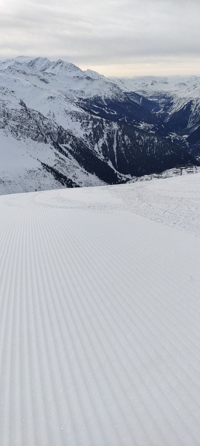 La neige sur piste était globalement excellente, douce et juste un poil lustrée avec les passages en fin de journée, mais sans plus. Même sur les noires très raides de la Thuile, qui peuvent vite se transformer en patinoire inclinée quand il n'a pas neigé depuis longtemps, l'accroche était très bonne.