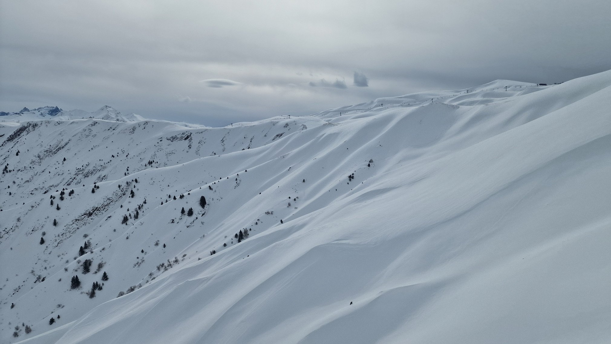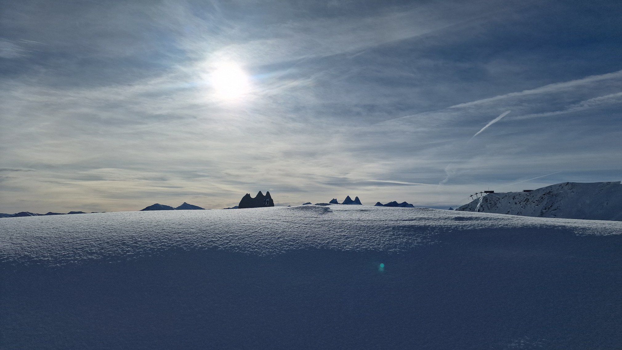 La neige est bonne au petit matin mais pas si profonde, le vent fort est passé par là. En altitude c'est encore plus marqué, et le redoux n'arrange les choses.