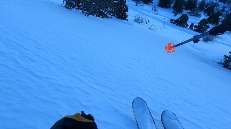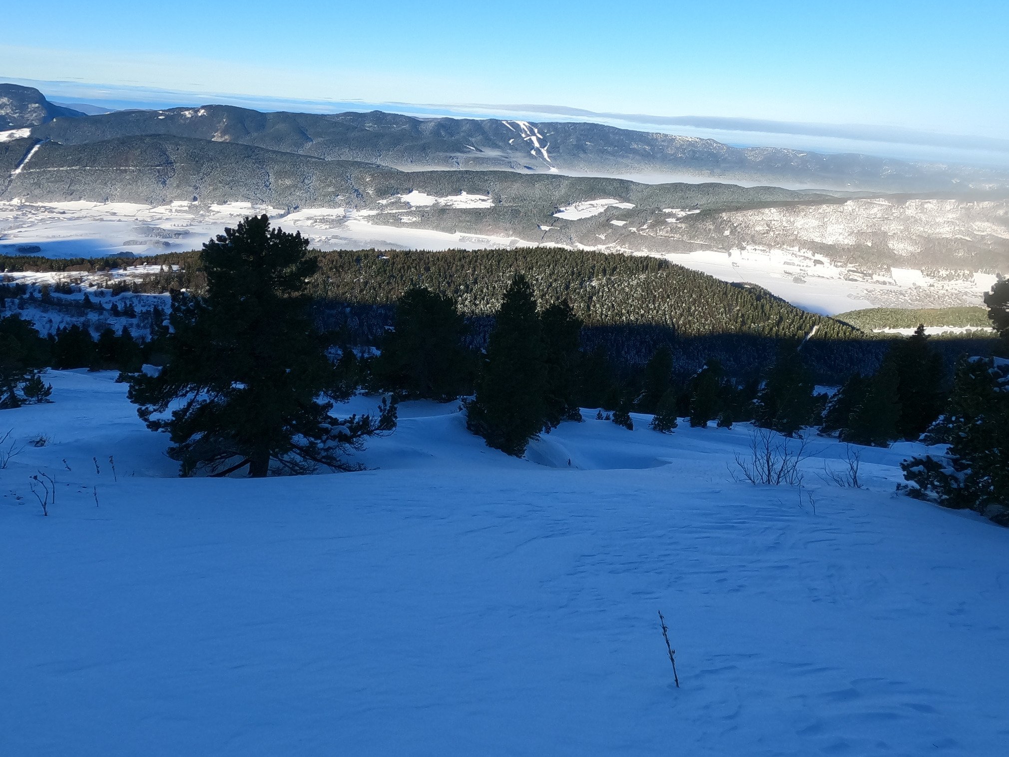 Alors je me motive pour une petite marche d’approche histoire d’allonger une descente. Je suis les traces des randonneurs pour un bon 75 m de D+. Il fait chaud, et là-haut la neige est un peu plus ventée : on est déjà loin de la poudreuse légère du J+1. Ça s’est tassé, ça a un peu durci sur le dessus (surtout derrière les sapins), c’est irrégulier.