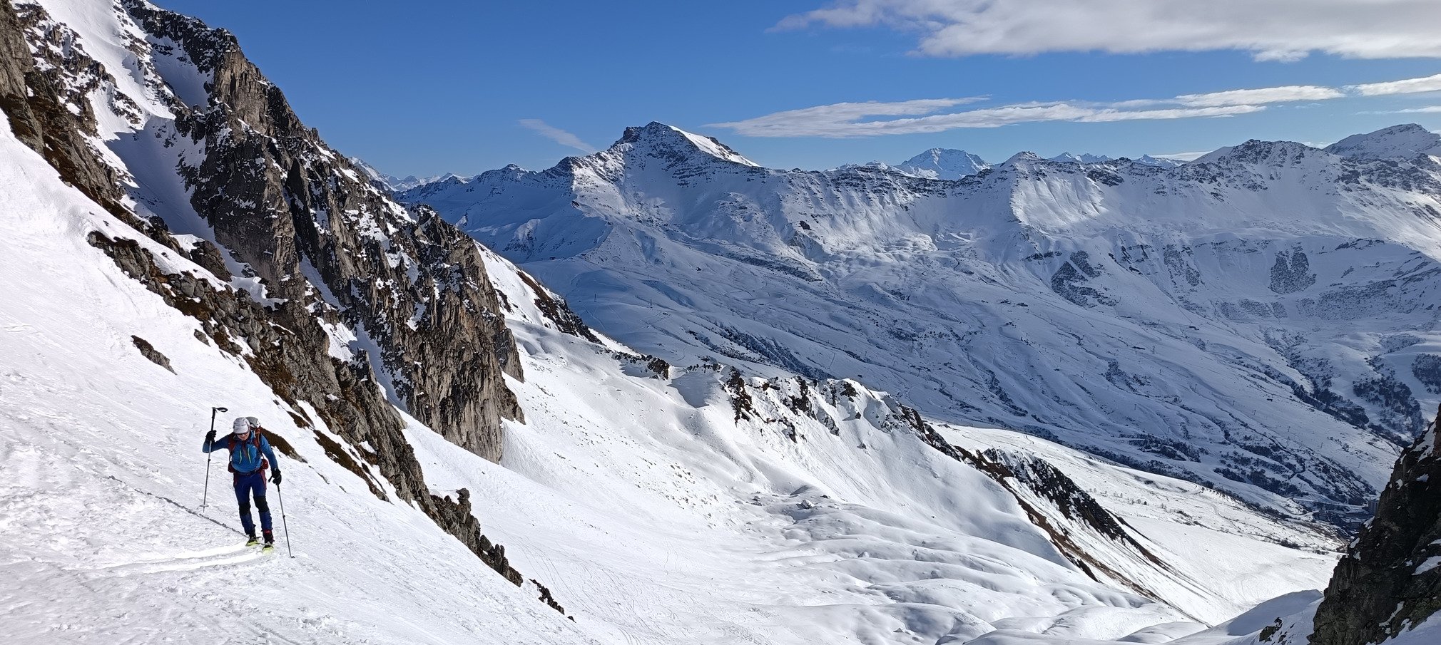 Franc soleil le matin au col de Sarvatan au dessus de François Longchamp (73) avant l'arrivée de la perturbation par l'ouest l'après-midi. Neige molle et bien trafolée.