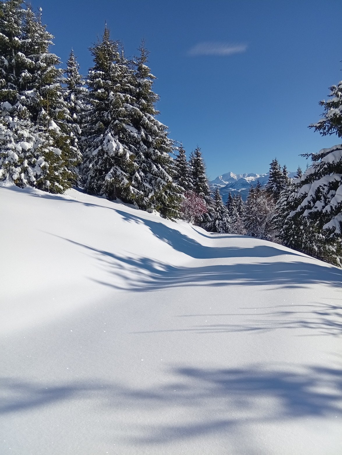 Comme d'habitude la neige est assez hétérogène suivant les expositions. Ça transforme tranquillement au soleil pendant que les versants à l'ombre restent parfaits.