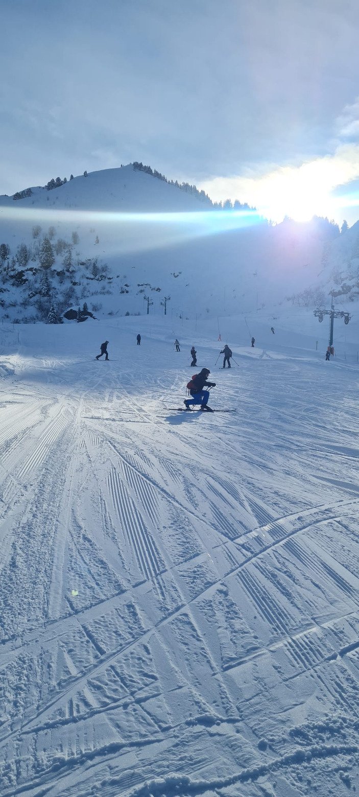 Le matin, nous avons tourné essentiellement sur la piste verte du TK du lac pour quelques petits exos visant à apprendre les bases, dont un consistant à se mettre en position Superman au moment de déclencher le virage (avec le poing en avant) ou un autre assez rigolo en tandem.