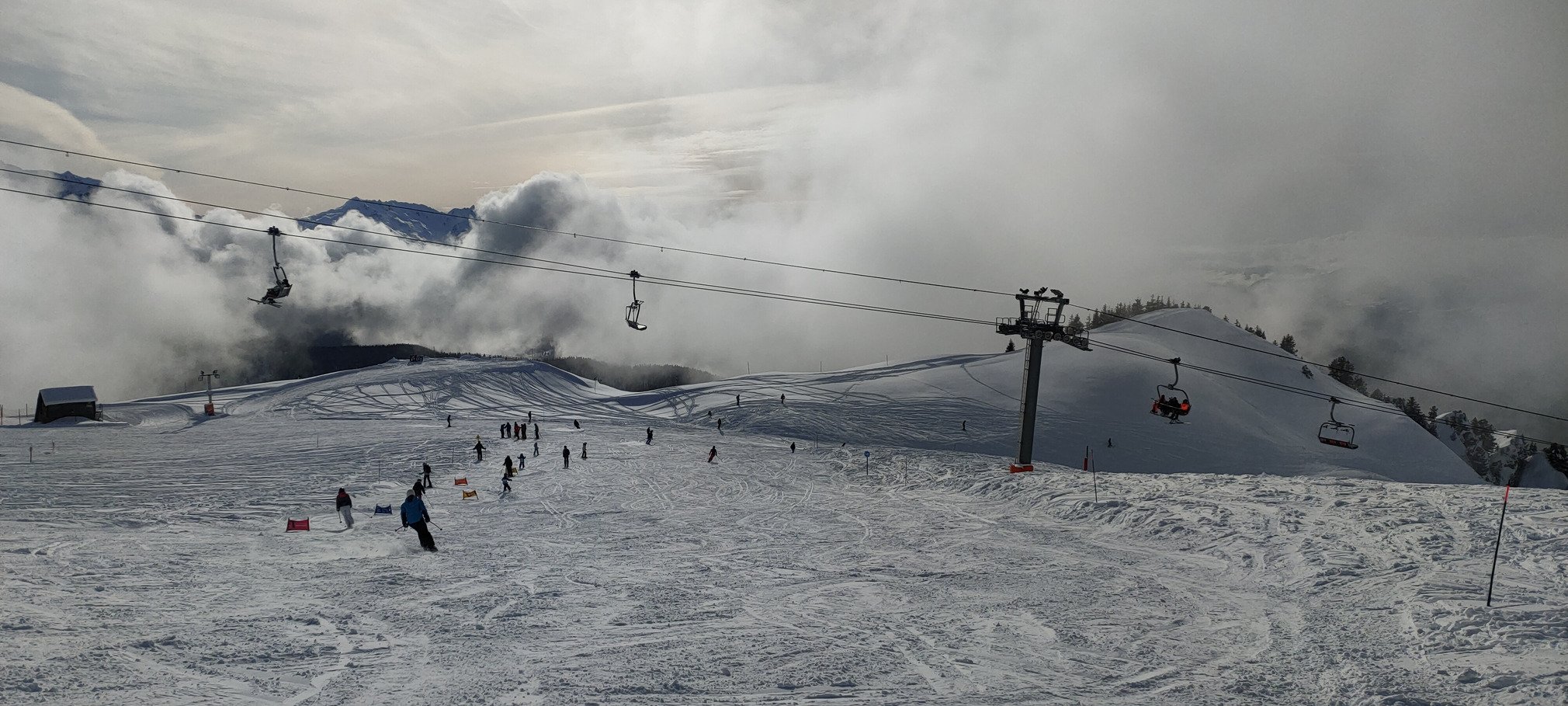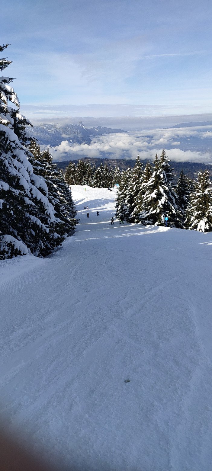 Les conditions étaient on ne peut plus parfaites pour cette découverte : grand soleil (sauf quelques nappes nuageuses après 14h, mais très furtives), un peu de monde mais vraiment très raisonnable et surtout une neige douce excellente sur piste. Même en fin de journée, ça restait très bon, et les portions un poil lustrées étaient extrêmement rares. Je ne suis pas du tout allé hors piste. Mais de ce que j'ai vu, ça devait être bien bon dans tout ce qui reste globalement à l'ombre. Avec la relative douceur du jour, en revanche, les pentes qui prennent le soleil ont dû commencer à croûter un peu. Elles ne devraient pas être géniales à skier demain, d'autant qu'elles ont été bien traffolées. Par contre, celles à l'ombre devraient rester bonnes, même si elles y pas mal rayées.