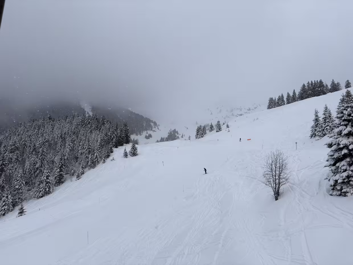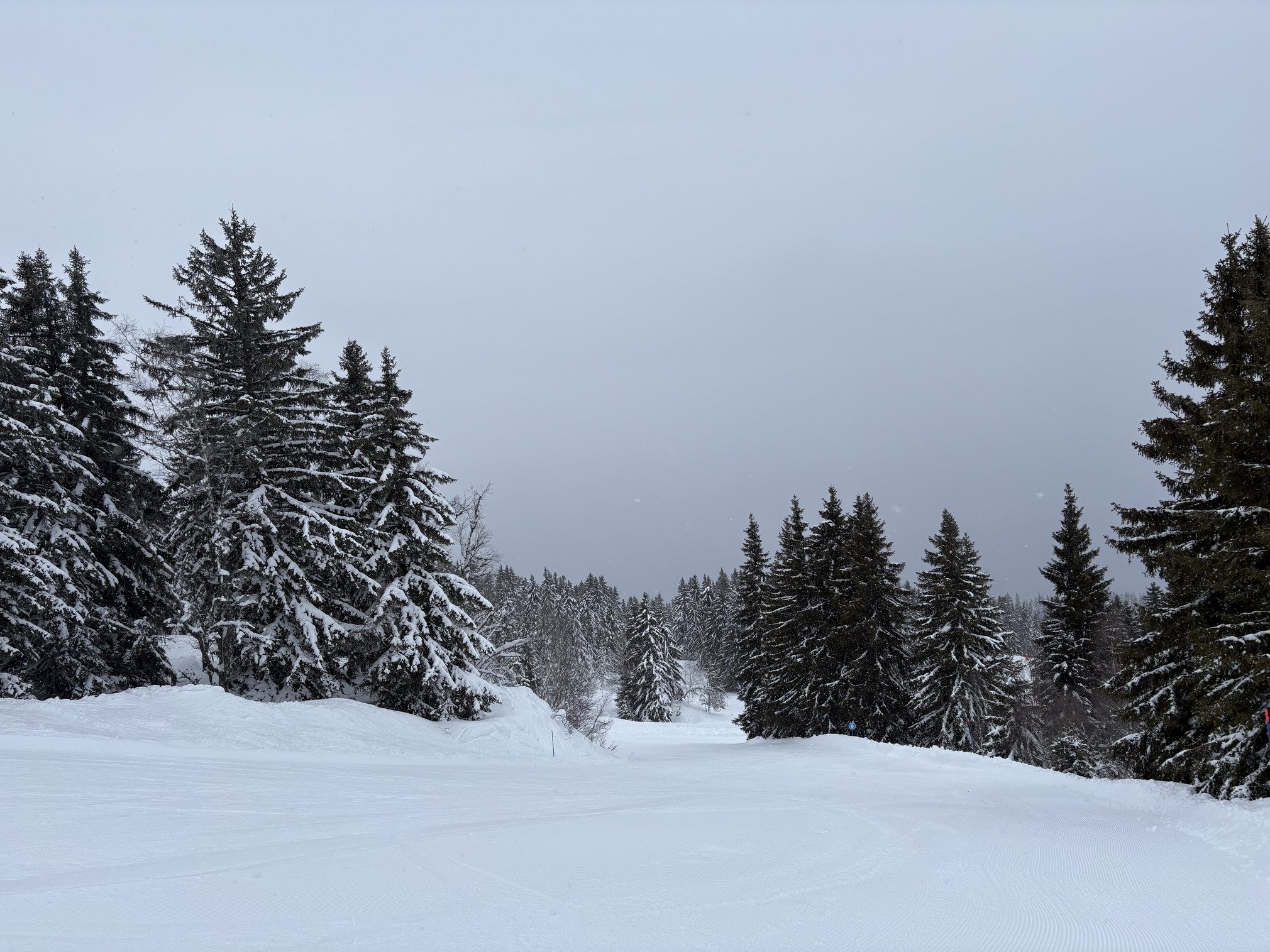 Ensuite, place au ski sur piste tous ensemble, en douceur, avec une neige juste parfaite. En fin de matinée, le brouillard est monté d’un coup et la visibilité est devenue quasi nulle.
