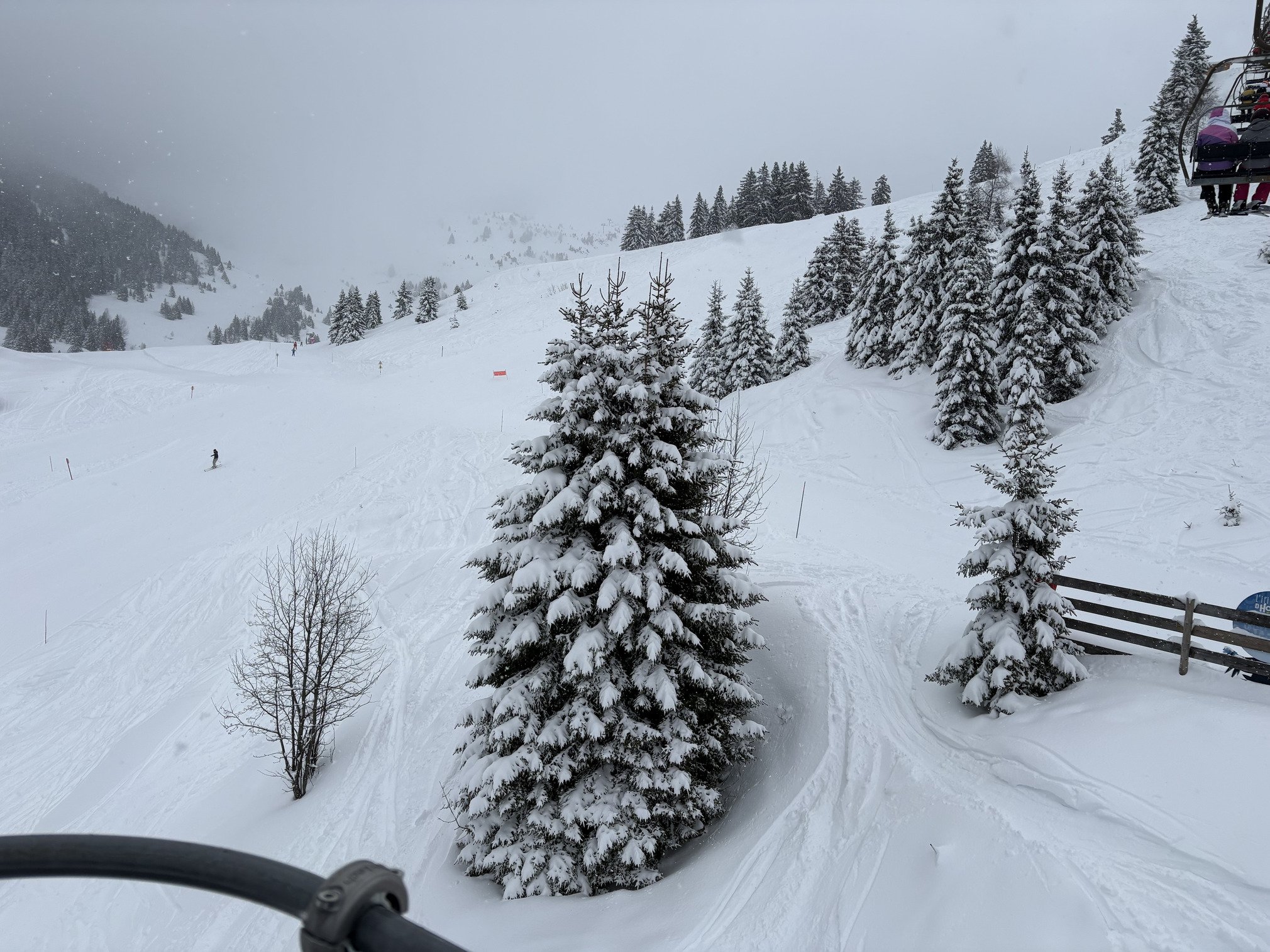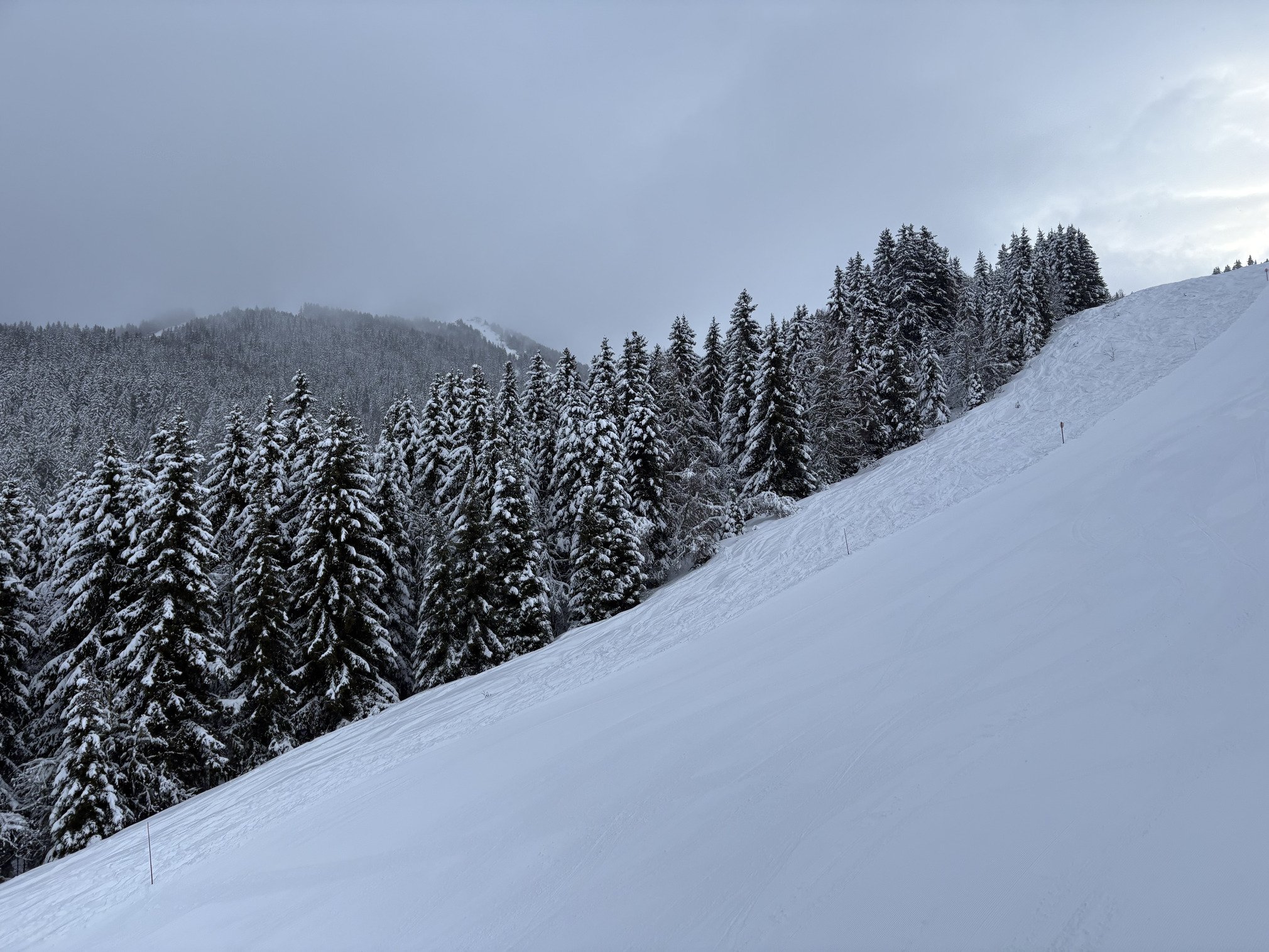 Il a bien neigé là-haut, mais le travail de la veille a été sérieux : pas mal de zones déjà bien défoncées. Il reste toutefois quelques très beaux virages à trouver en forêt, surtout dans les passages serrés, avec encore 30 à 50 cm de poudre bien légère.