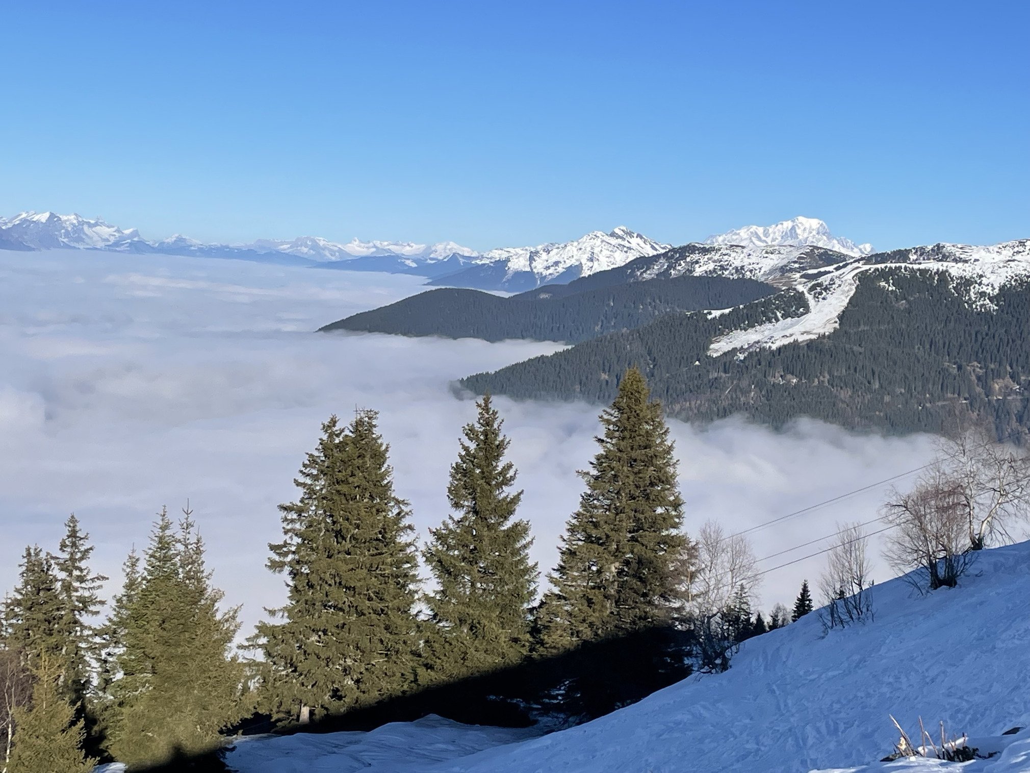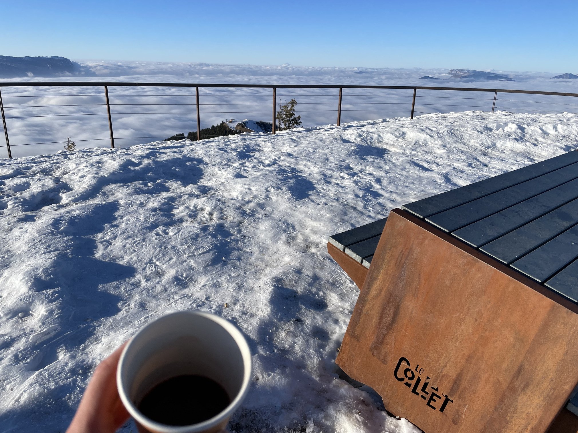La mer de nuages était plus épaisse que les jours précédents, ne gâchant rien au paysage et nous laissant profiter du soleil qui réchauffait à peine les visages avec -7 degrés affichés 🥶.